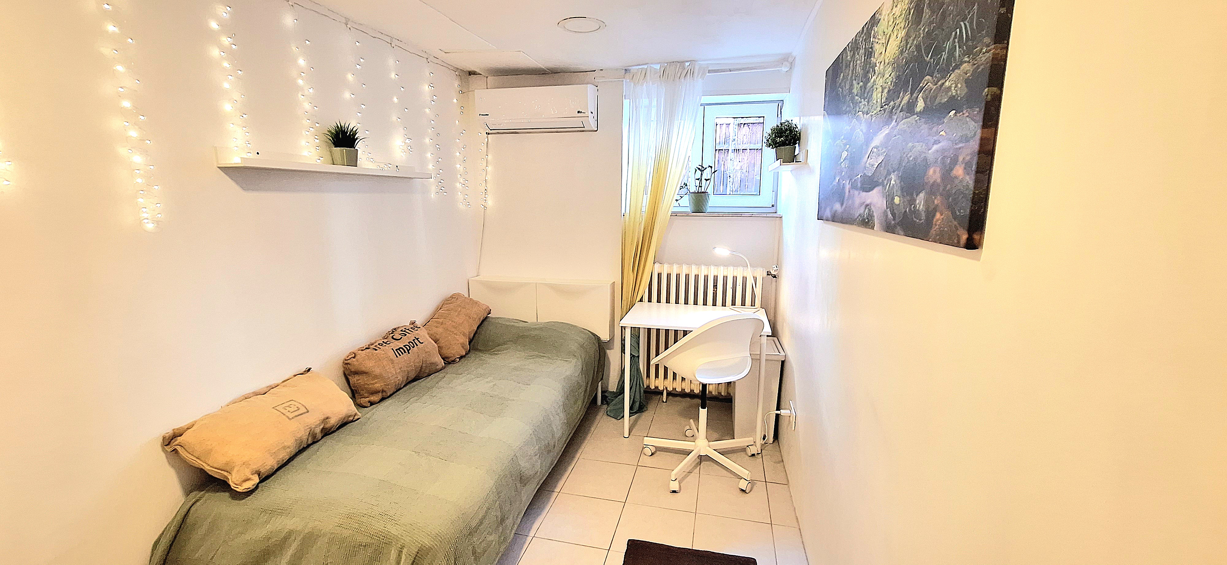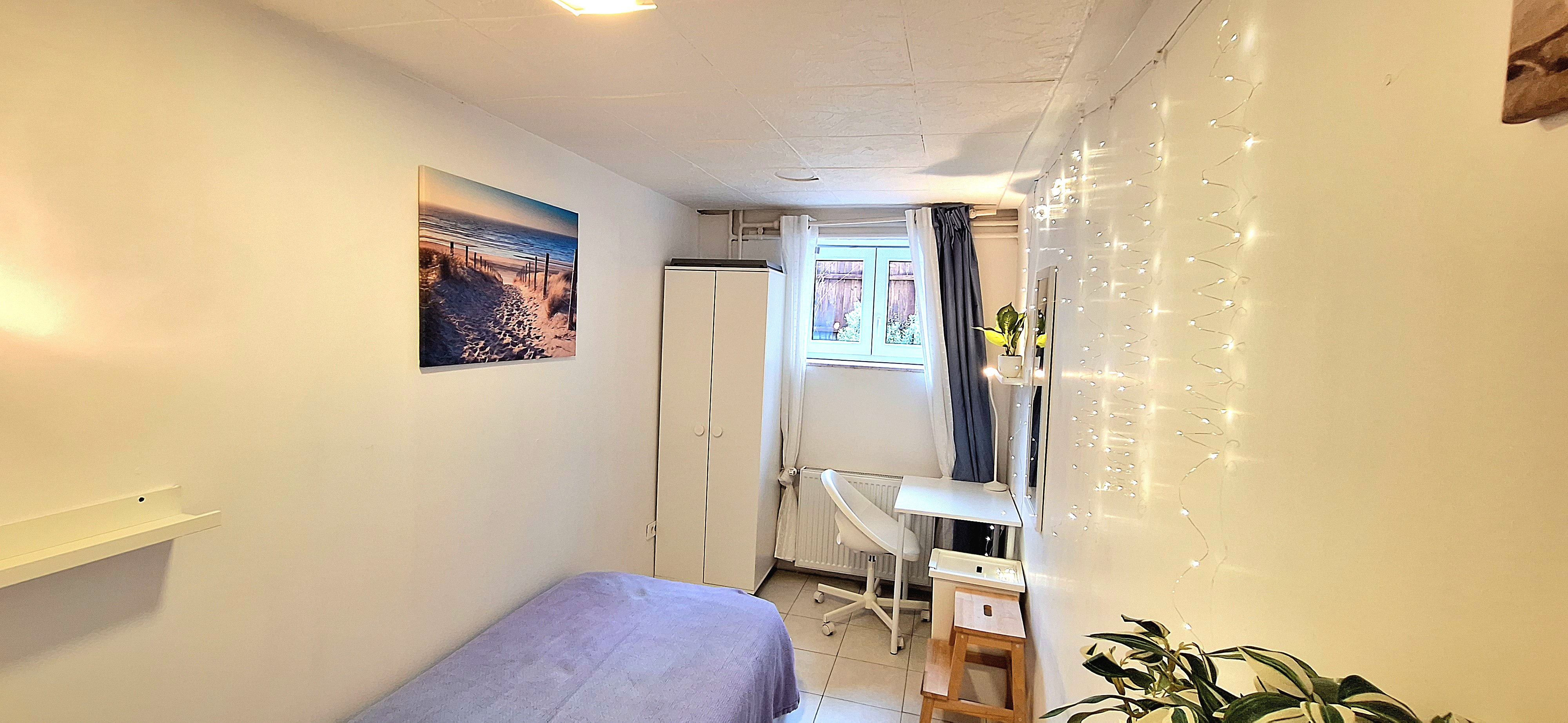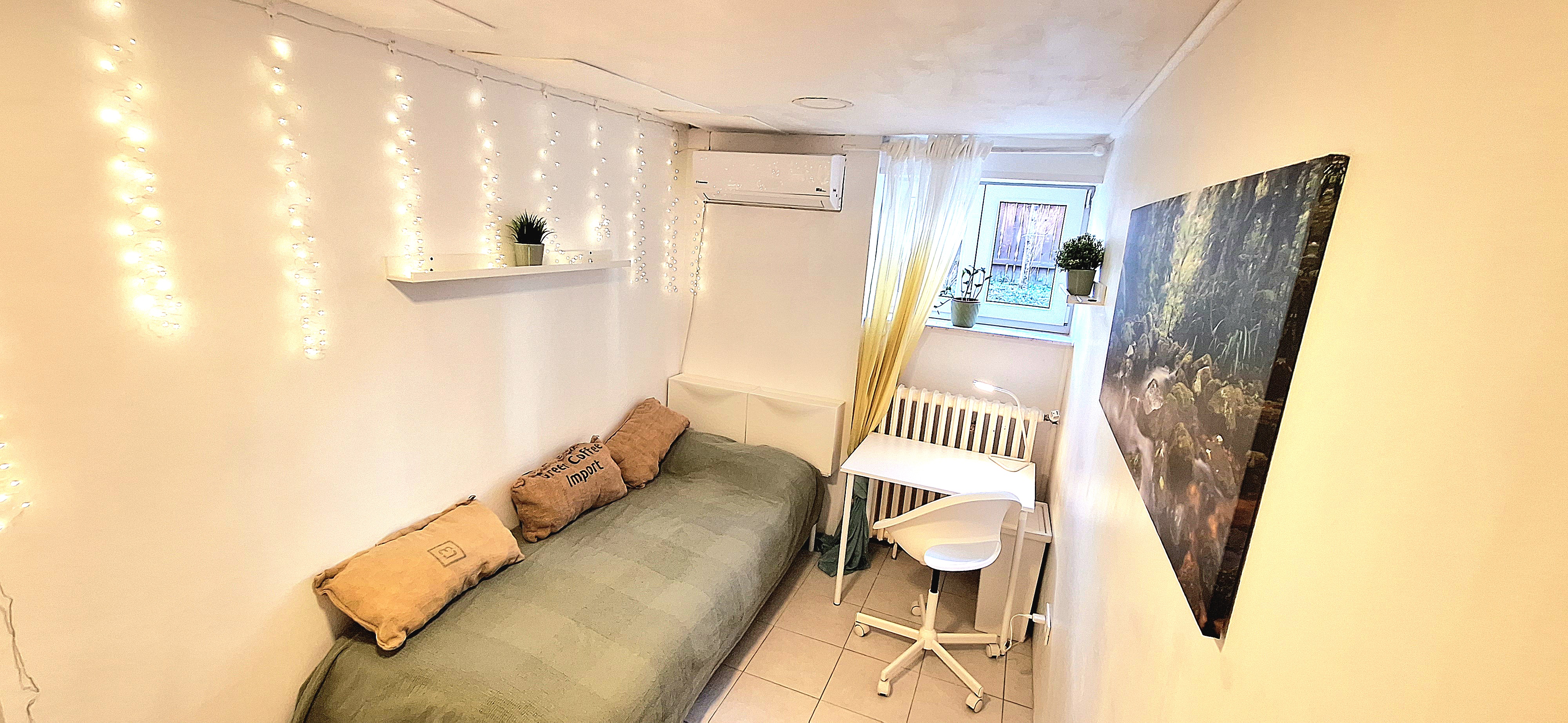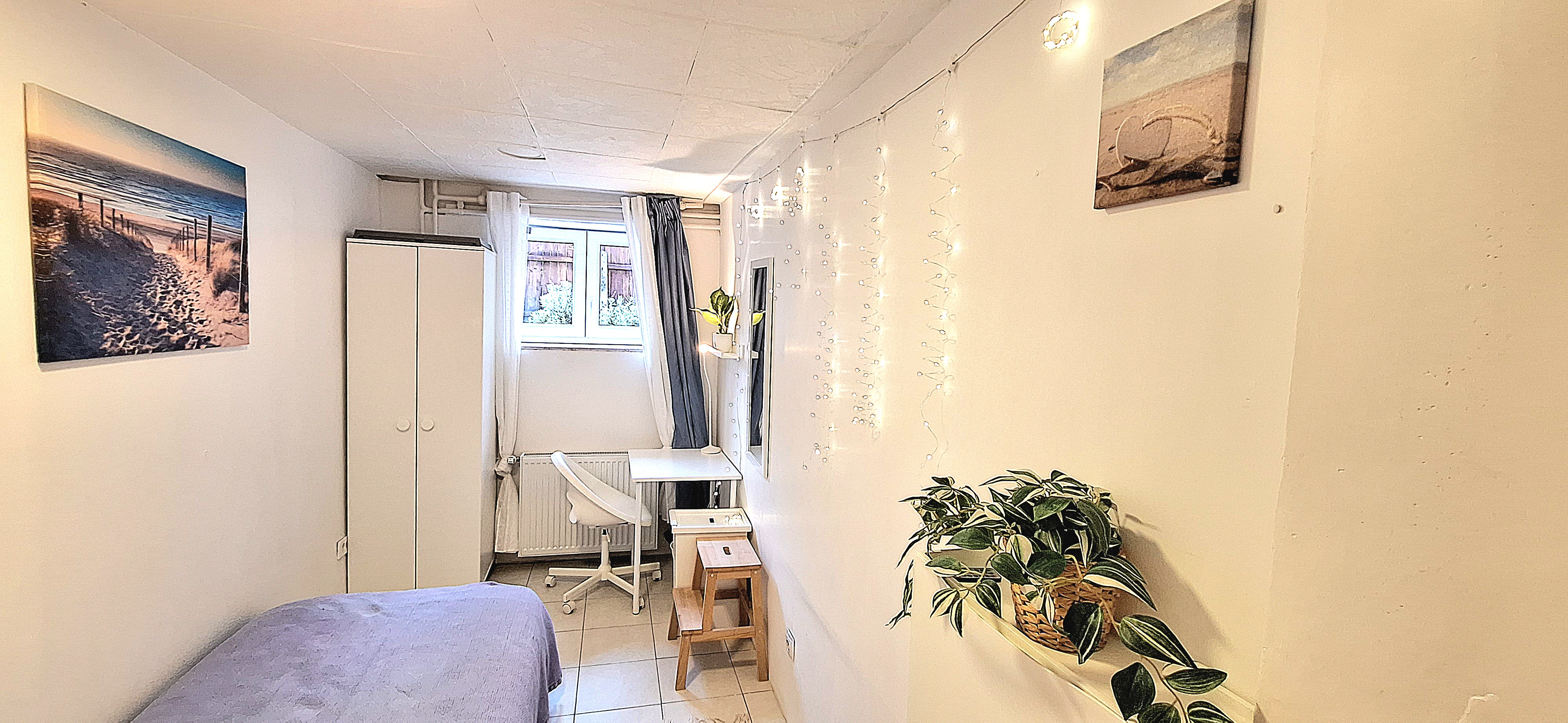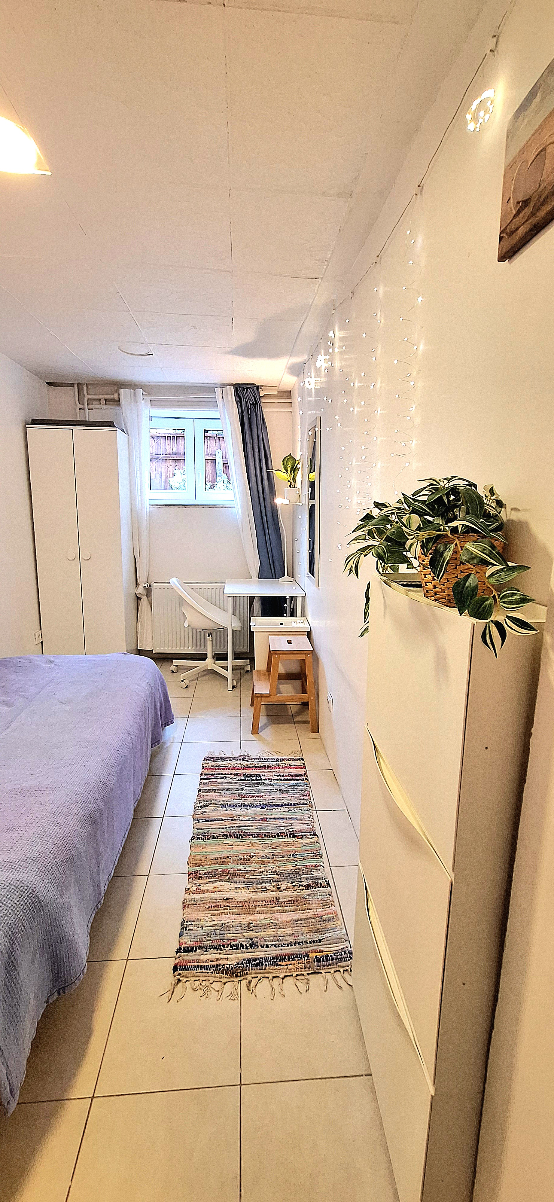 Sunflower room is facing South and its located in the ground level of the house. Its great for one person that needs a longer stay or a bigger room space as it is one of the biggest rooms in the house. The room is fully furnished with a 160 x 200 bed that can be for 2 people or comfort, table, chair, lamp, drawer cupboard and a big cabinet, black out curtain and of course Fairy lights. Tennant is allowed to use all common spaces of the house – ground level bathroom (shower, toilet and sink) fully equipped small kitchen, lounge room , Main Floor Kitchen and terrace and garden area. Price 500EUR + utilities.