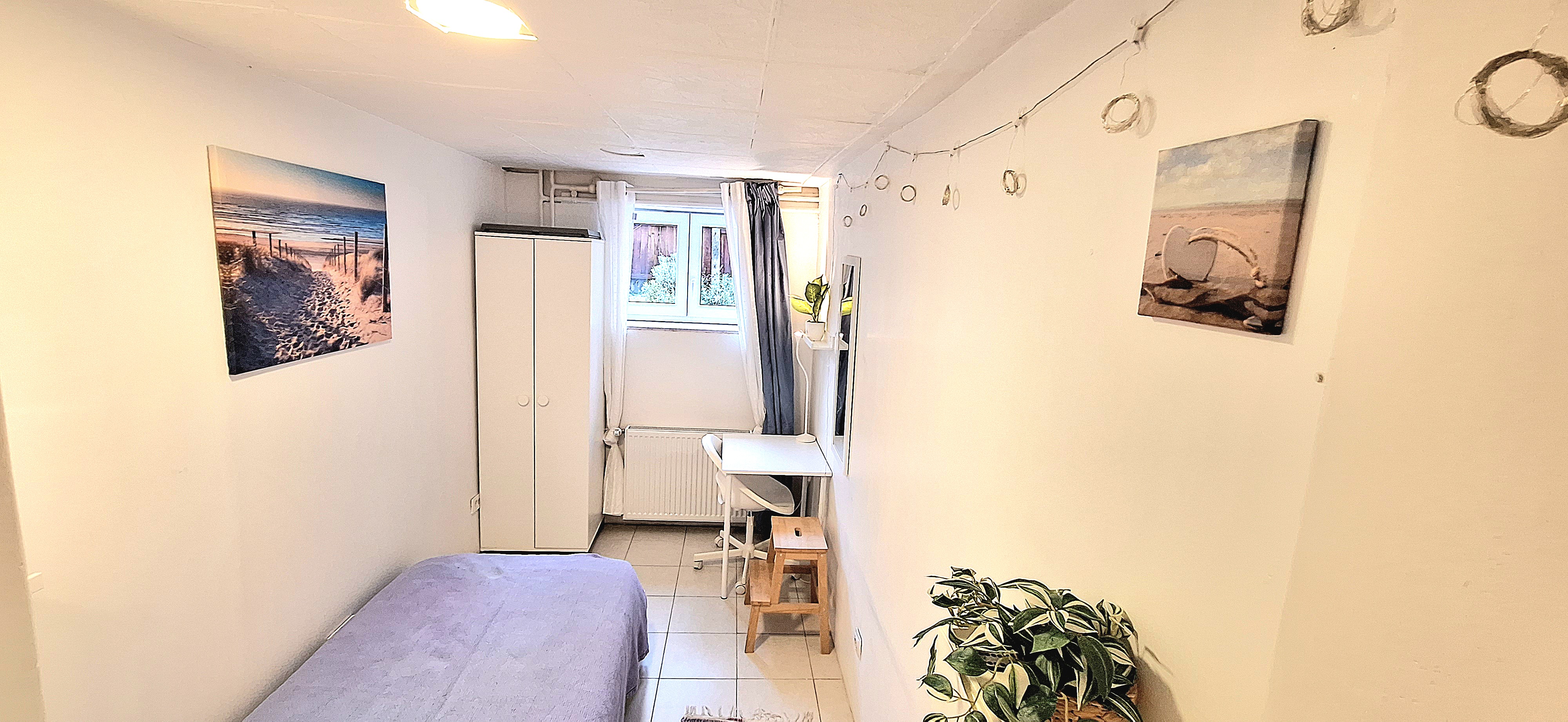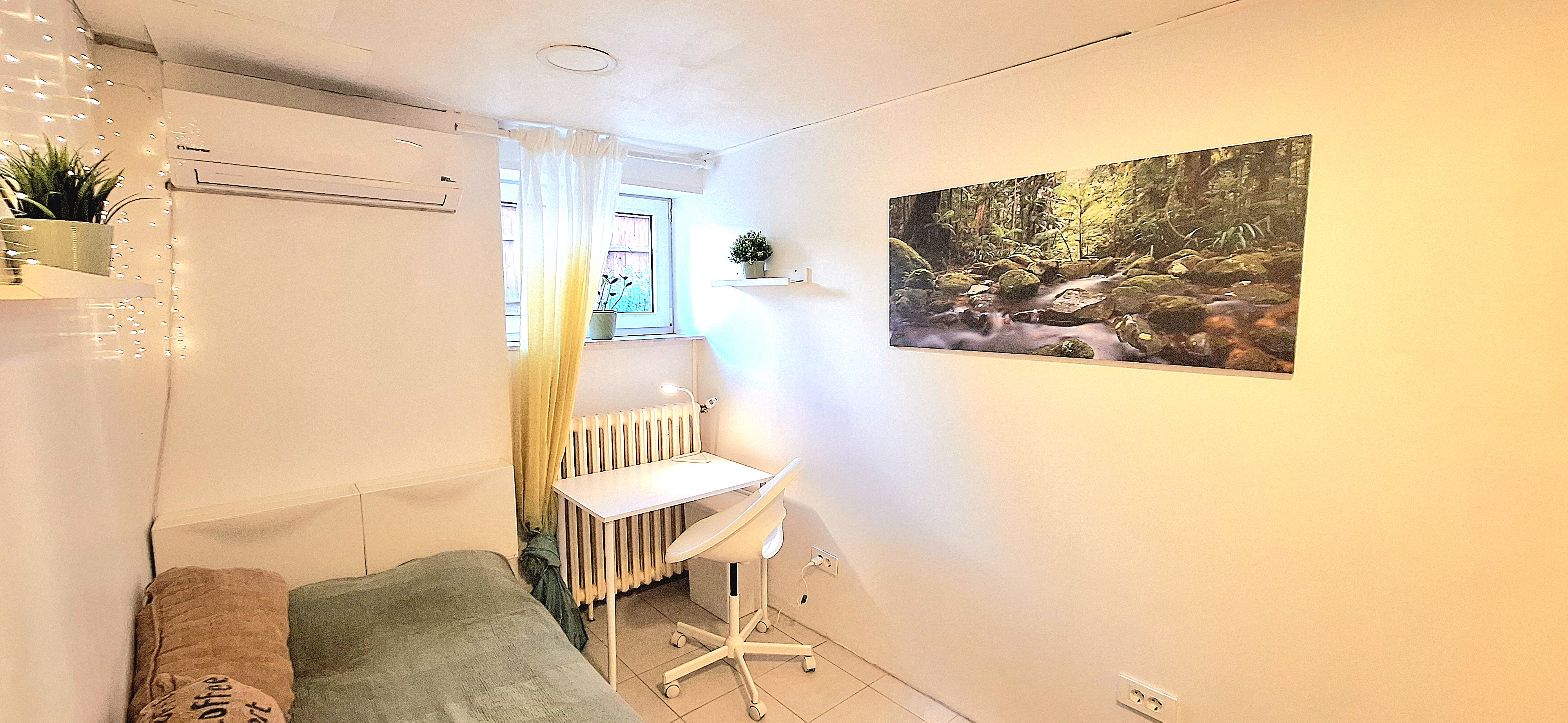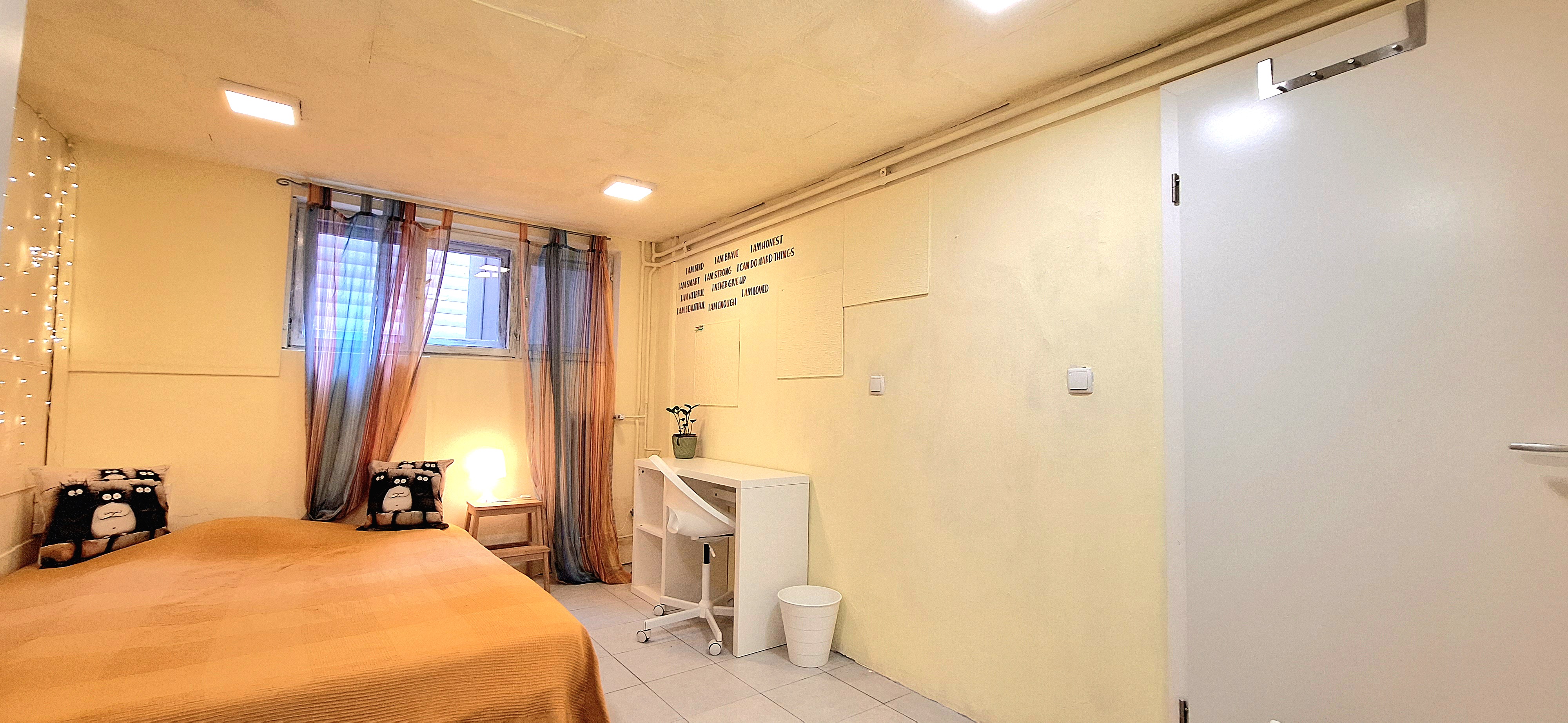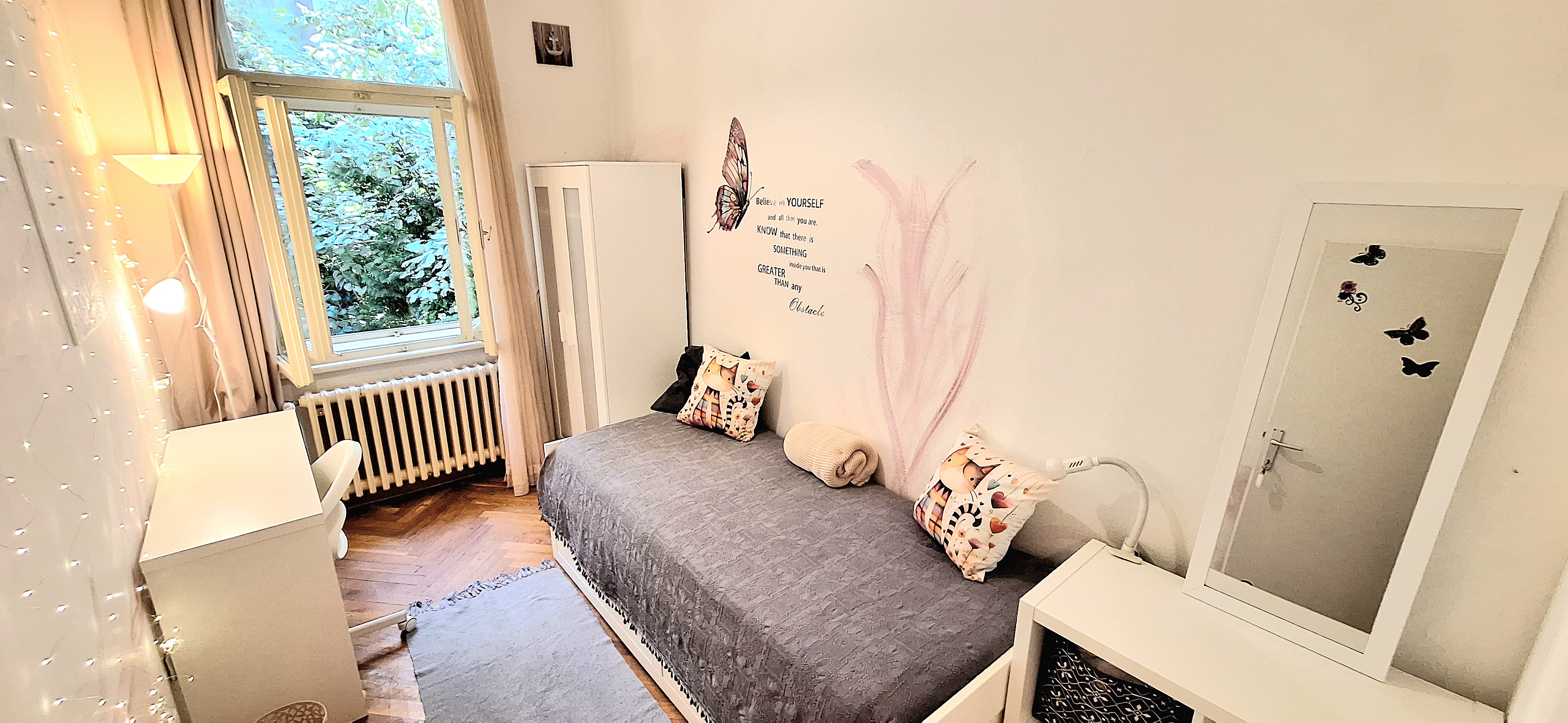 Sunflower room is facing South and its located in the ground level of the house. Its great for one person that needs a longer stay or a bigger room space as it is one of the biggest rooms in the house. The room is fully furnished with a 160 x 200 bed that can be for 2 people or comfort, table, chair, lamp, drawer cupboard and a big cabinet, black out curtain and of course Fairy lights. Tennant is allowed to use all common spaces of the house – ground level bathroom (shower, toilet and sink) fully equipped small kitchen, lounge room , Main Floor Kitchen and terrace and garden area. Price 500EUR + utilities.