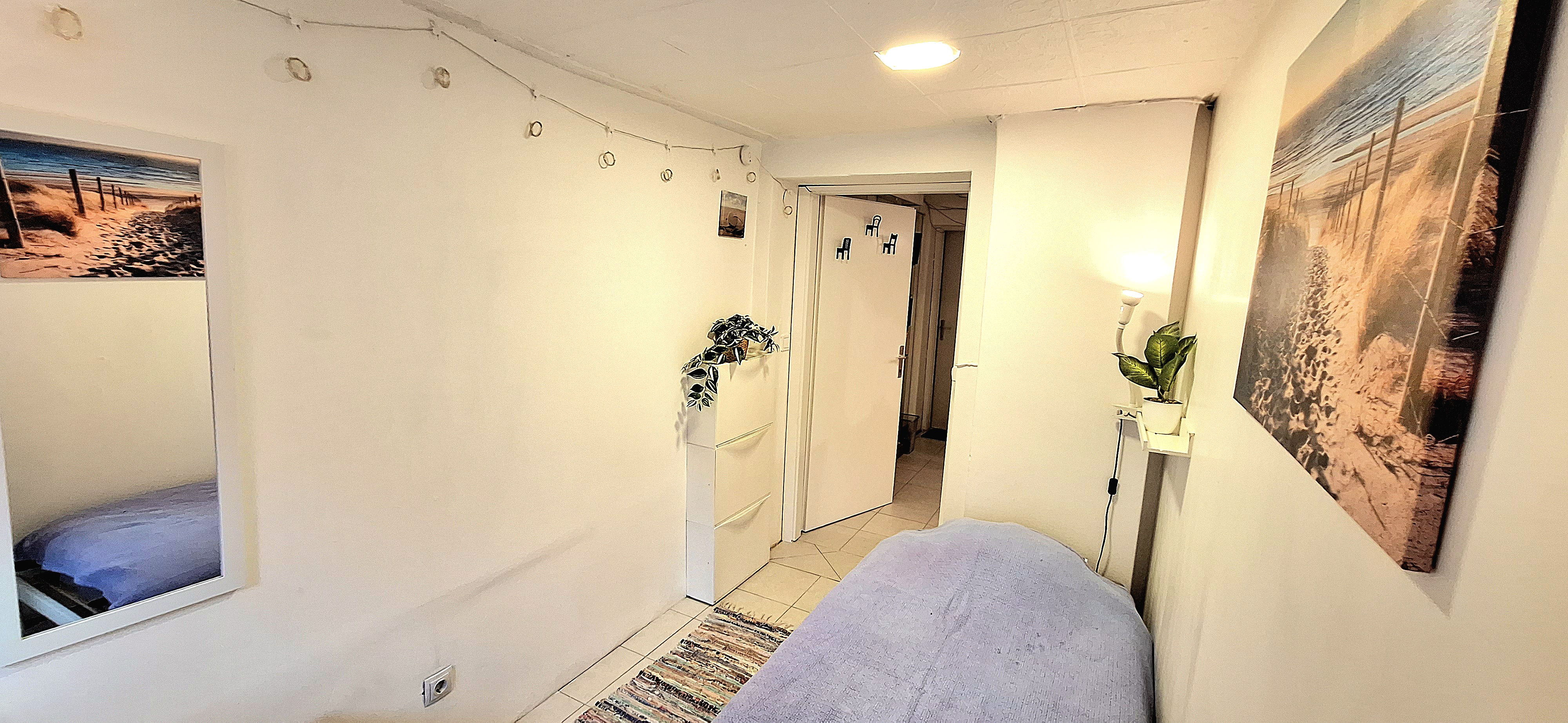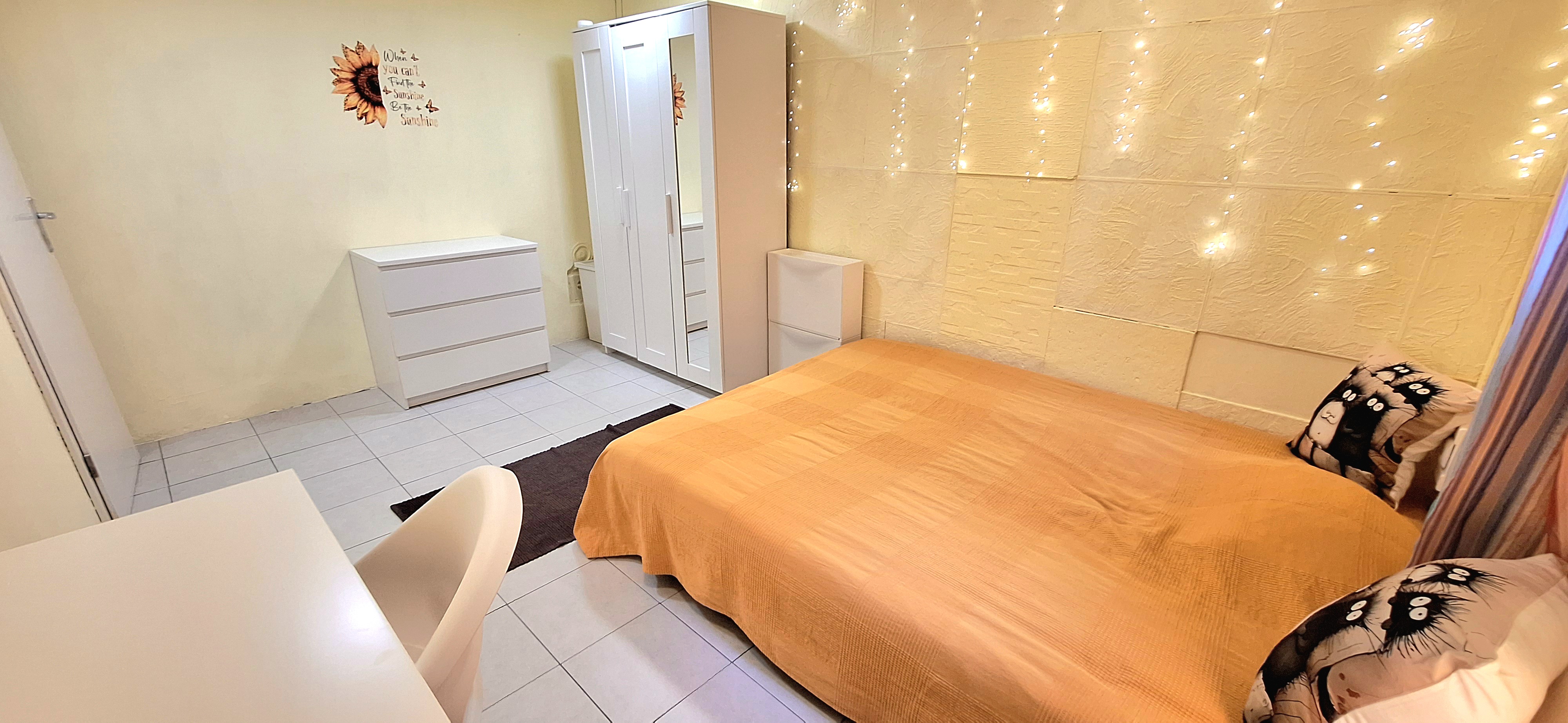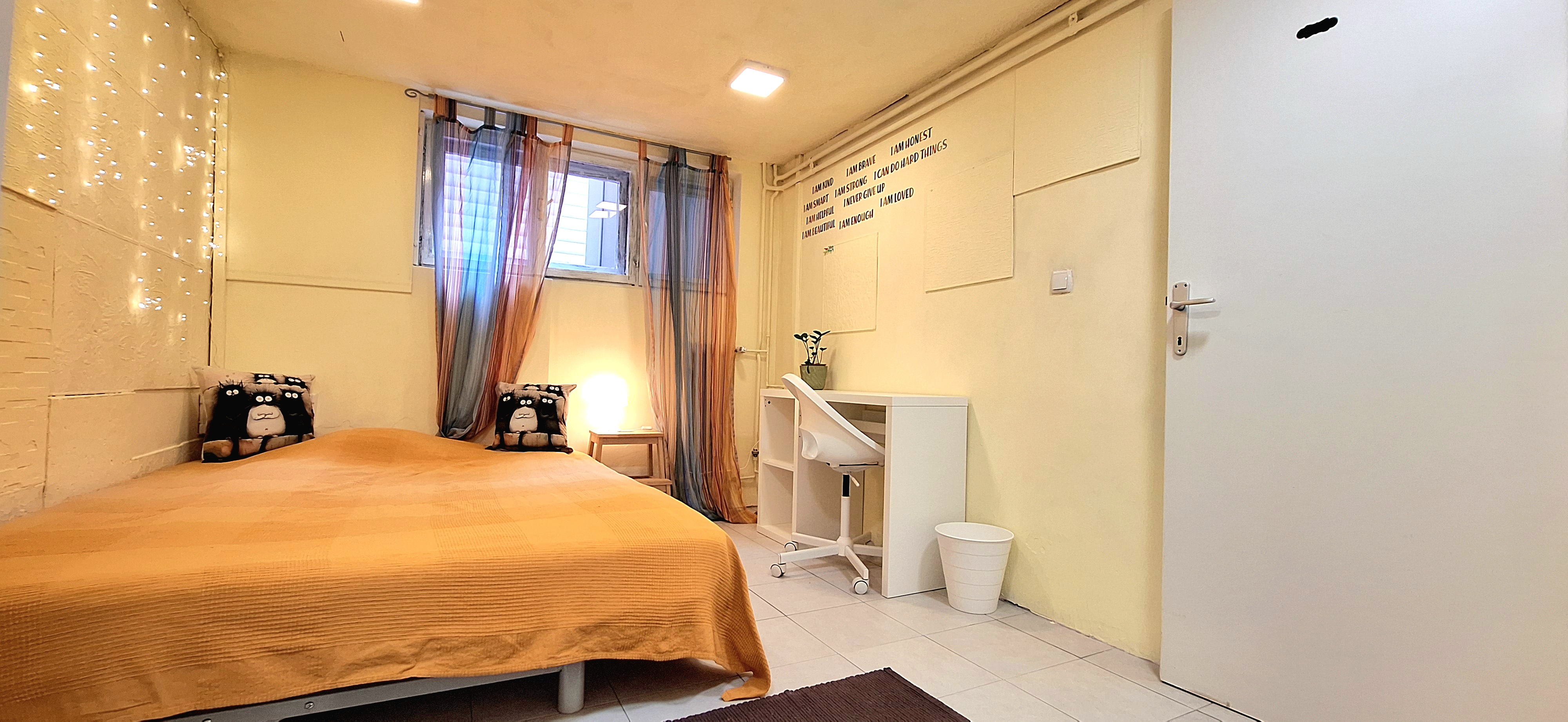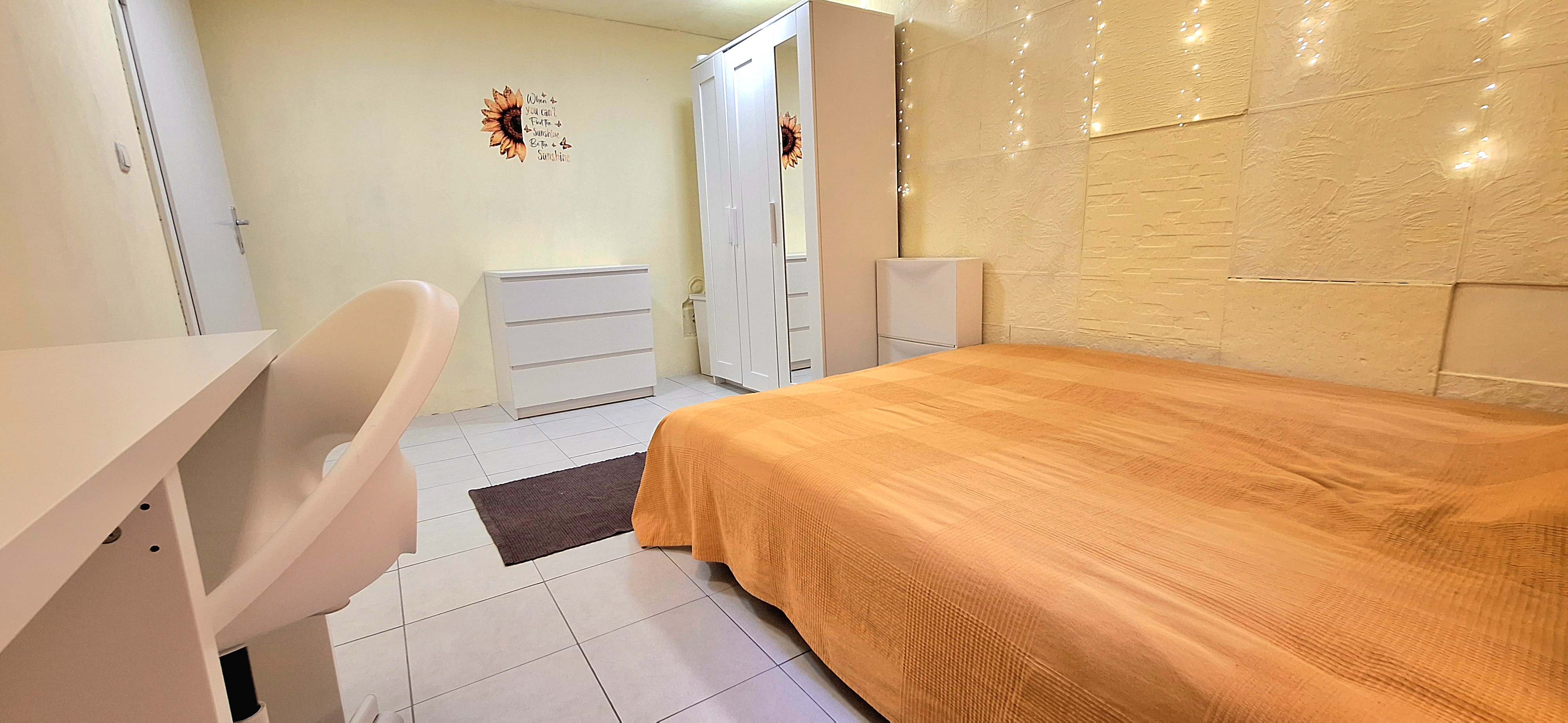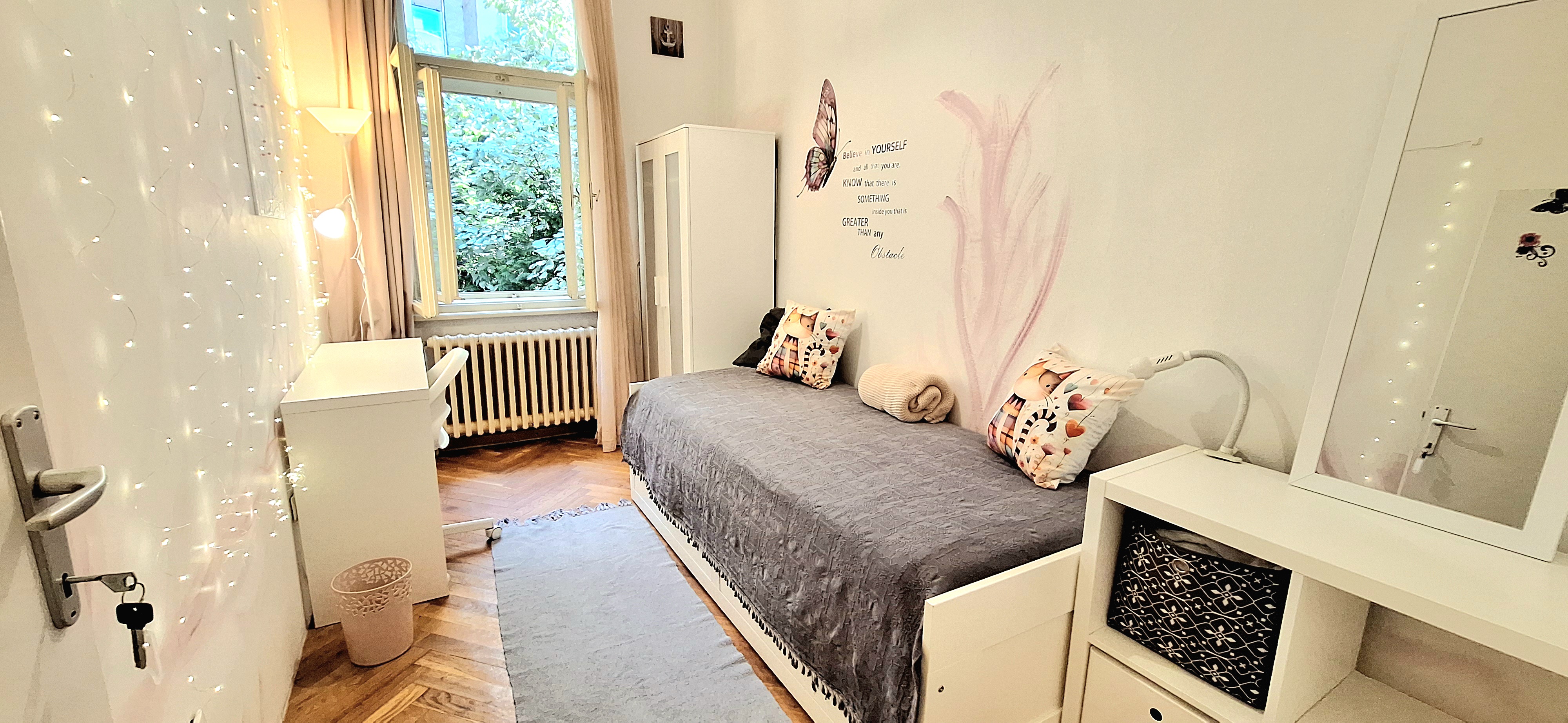Sunflower room is facing South and its located in the ground level of the house. Its great for one person that needs a longer stay or a bigger room space as it is one of the biggest rooms in the house. The room is fully furnished with a 160 x 200 bed that can be for 2 people or comfort, table, chair, lamp, drawer cupboard and a big cabinet, black out curtain and of course Fairy lights. Tennant is allowed to use all common spaces of the house – ground level bathroom (shower, toilet and sink) fully equipped small kitchen, lounge room , Main Floor Kitchen and terrace and garden area. Price 500EUR + utilities.