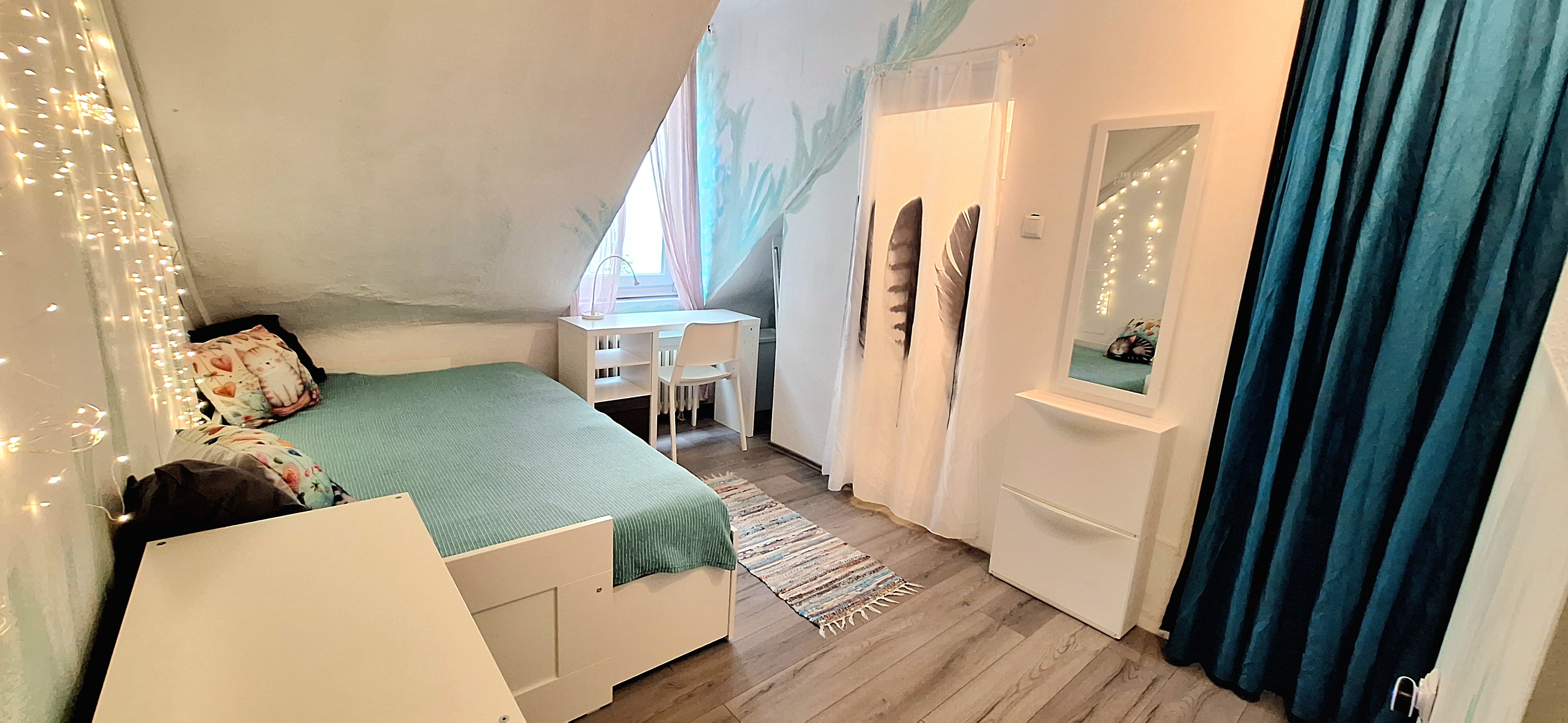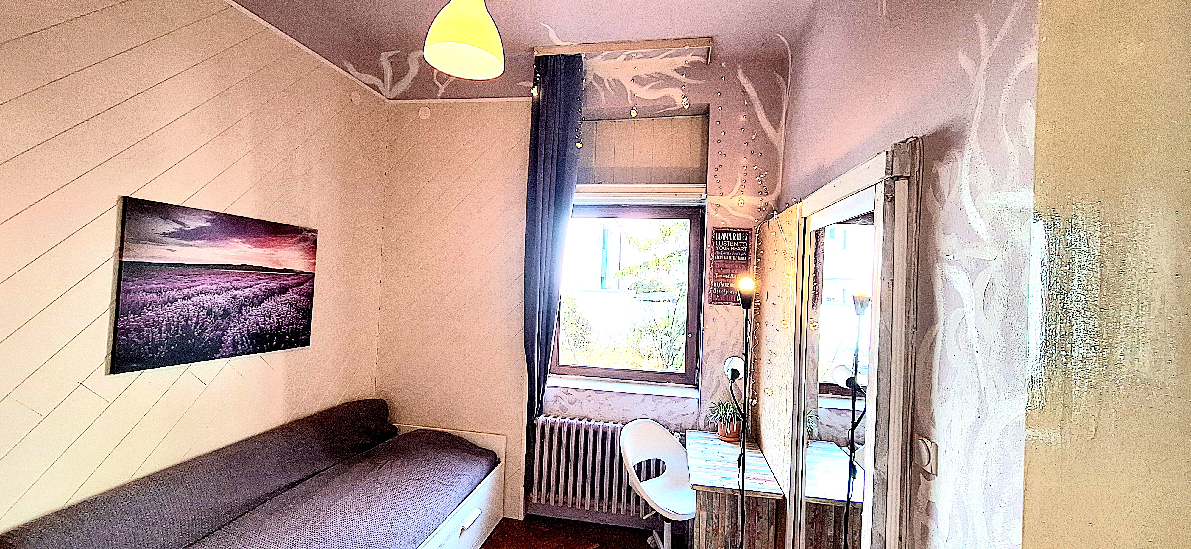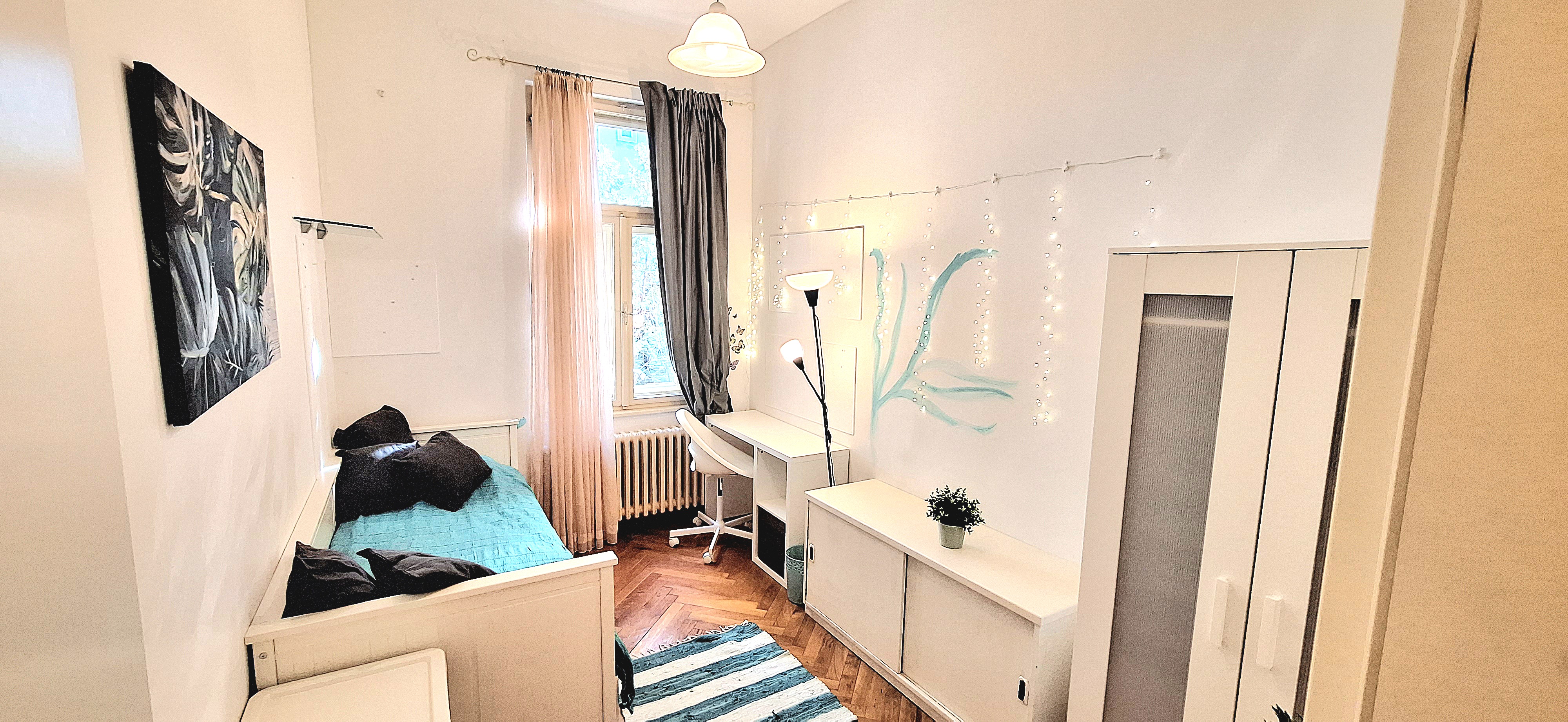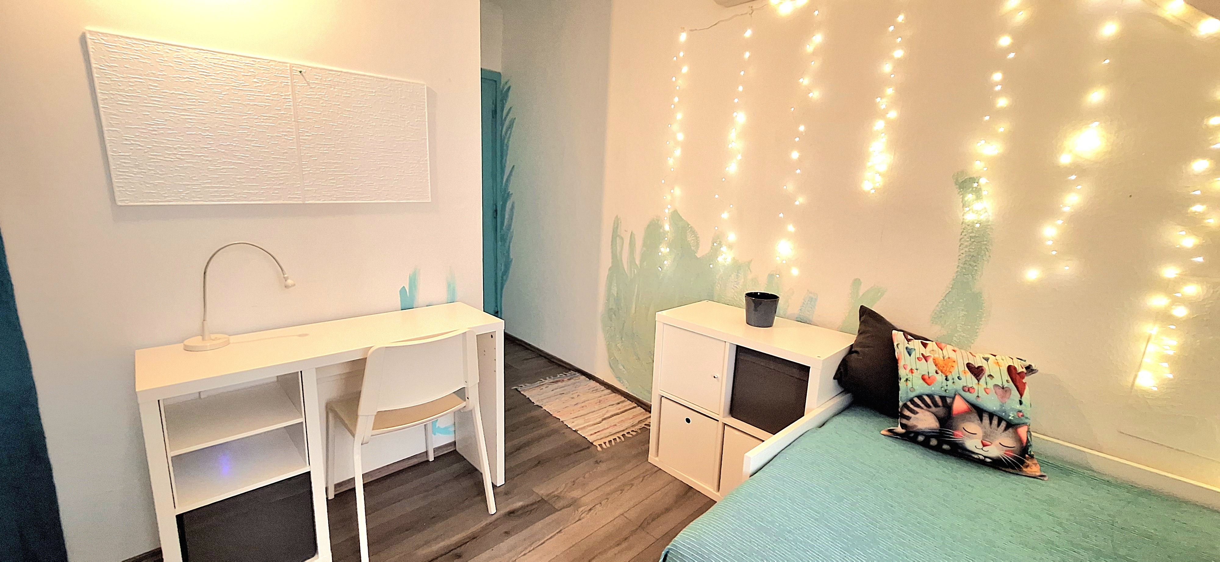 Blue room is fully furnished and comes with 1 cupboard, a table, chair 90x200cm bed, mirror, and a window that faces north with a view to the garden and has of course the signature Fairy lights for the warm and homey atmosphere. The tennant uses of following common spaces – bathroom (shower, washer, dryer, toilet and sink) fully equipped kitchen, lounge room and garden. Price 465 EUR + utilities.