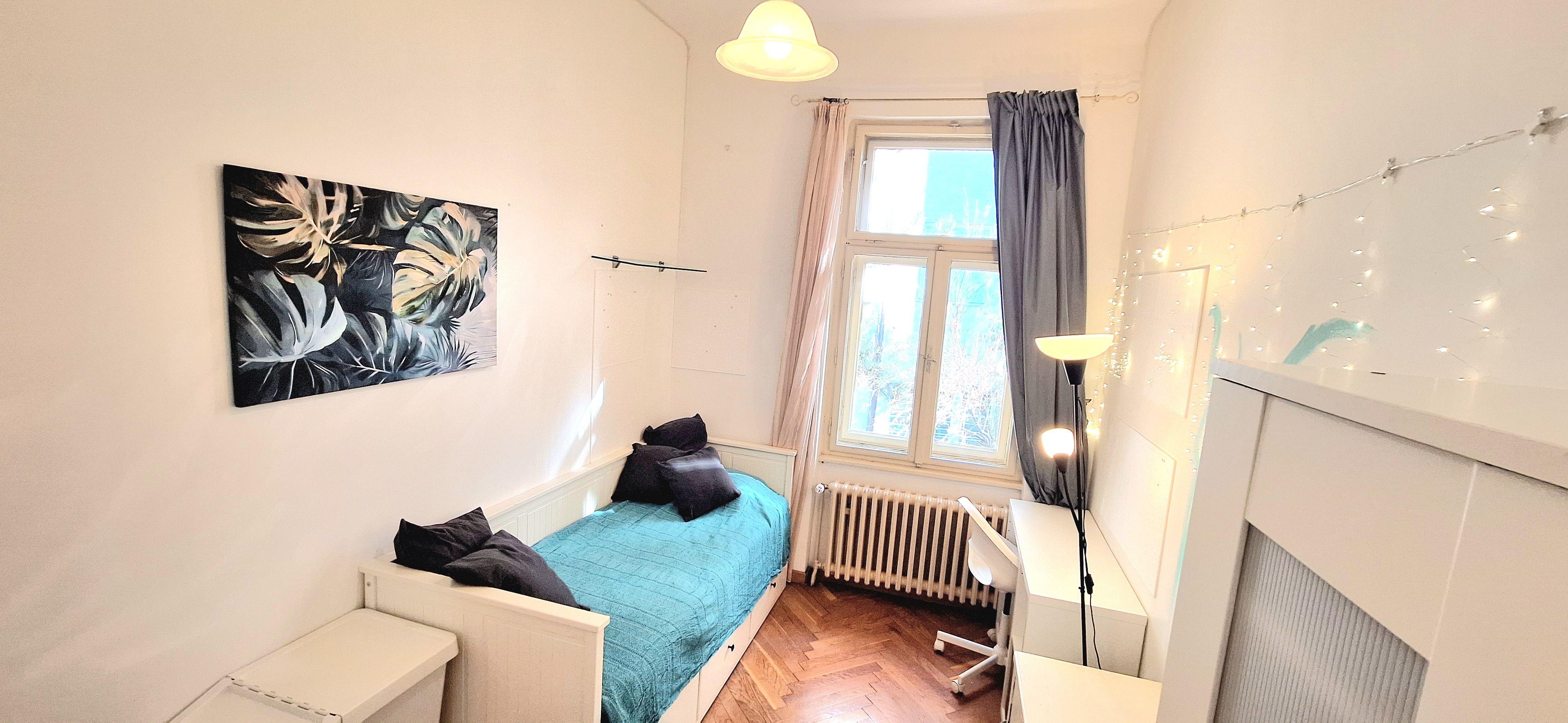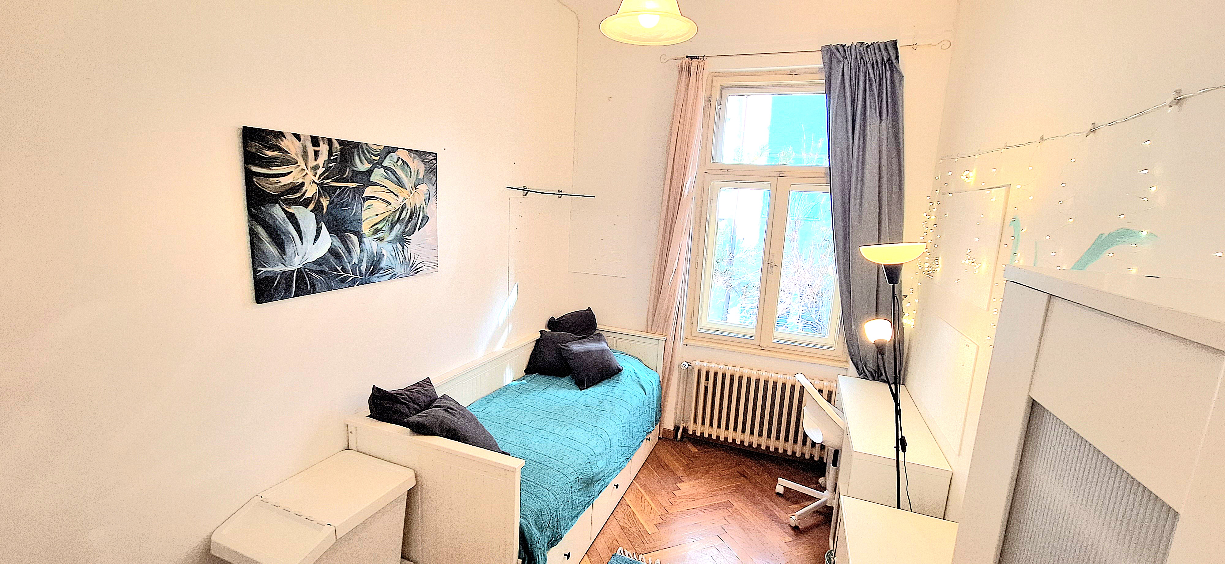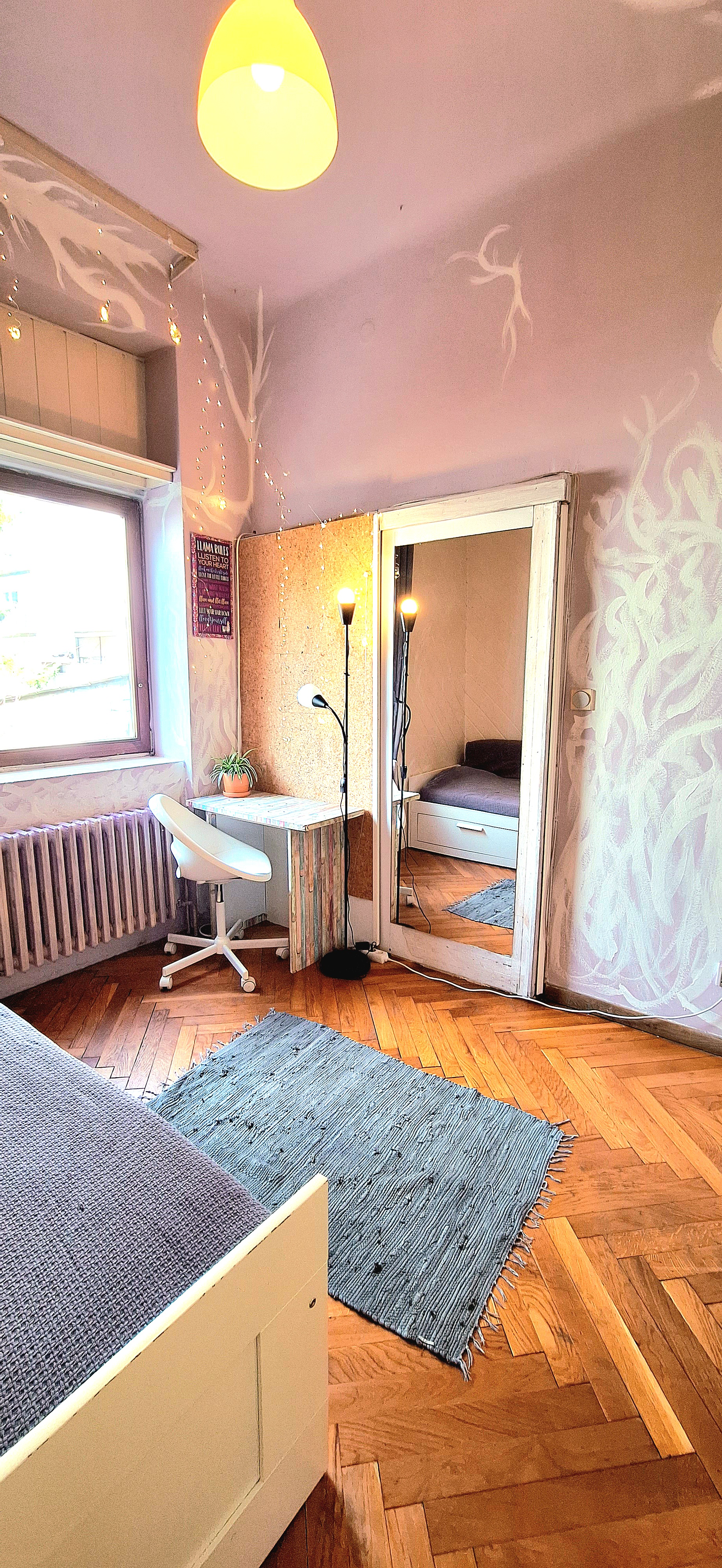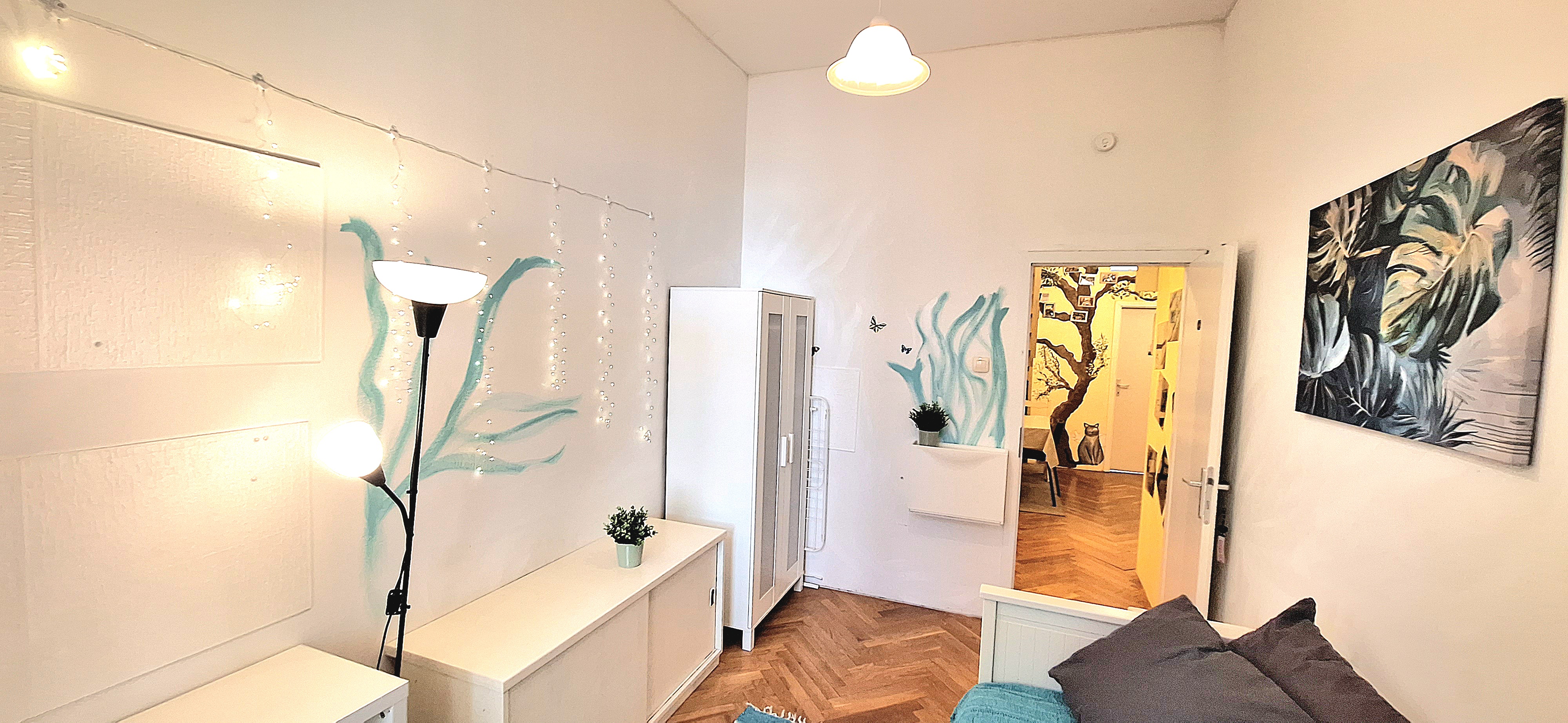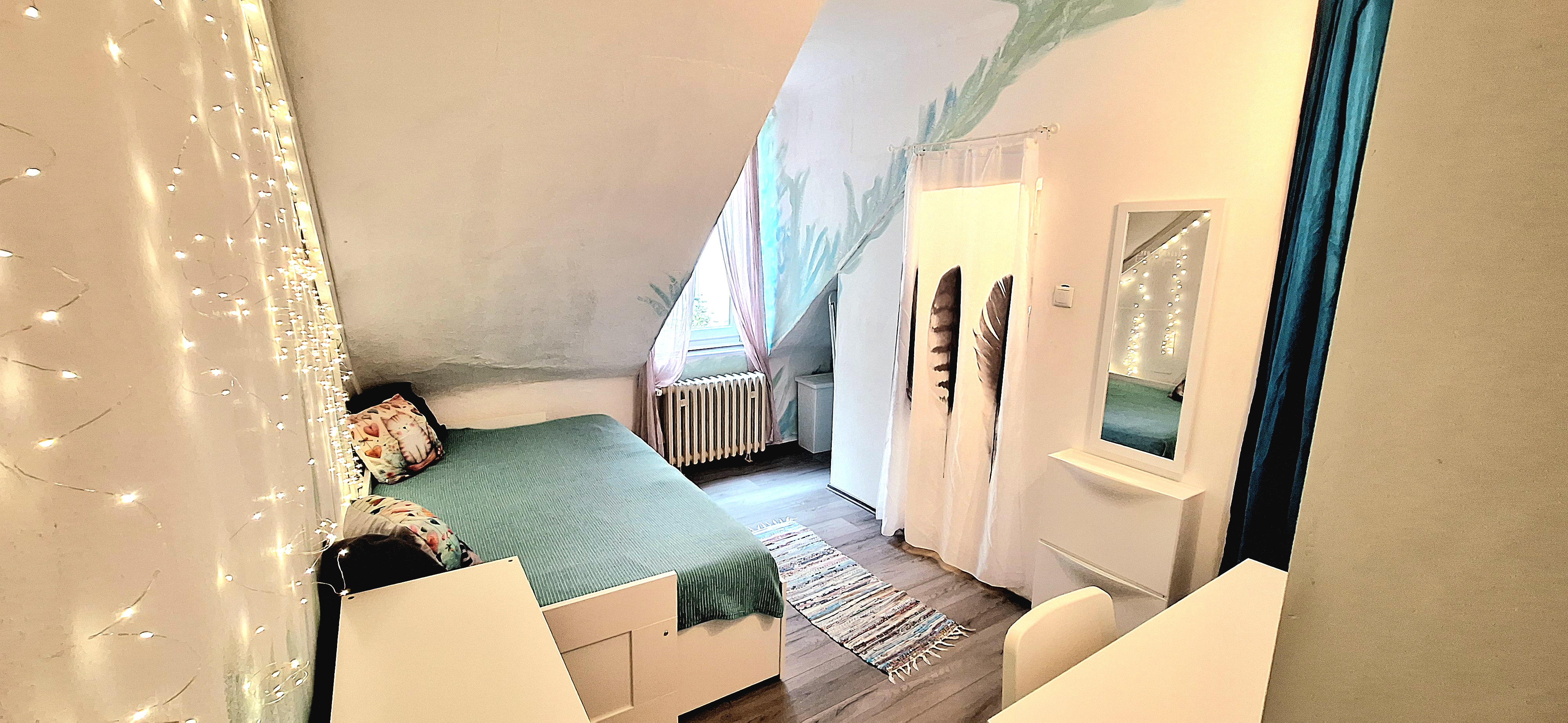 Blue room is fully furnished and comes with 1 cupboard, a table, chair 90x200cm bed, mirror, and a window that faces north with a view to the garden and has of course the signature Fairy lights for the warm and homey atmosphere. The tennant uses of following common spaces – bathroom (shower, washer, dryer, toilet and sink) fully equipped kitchen, lounge room and garden. Price 465 EUR + utilities.