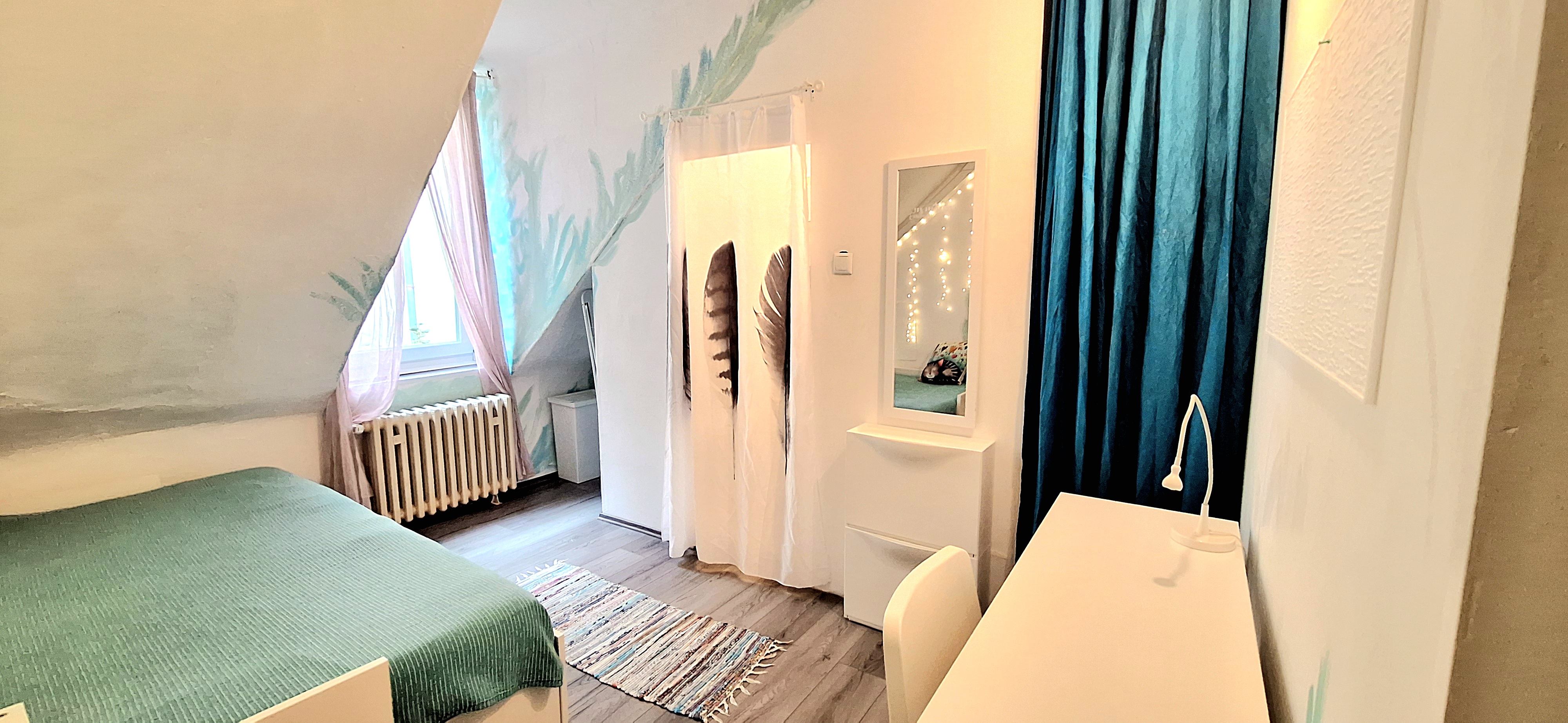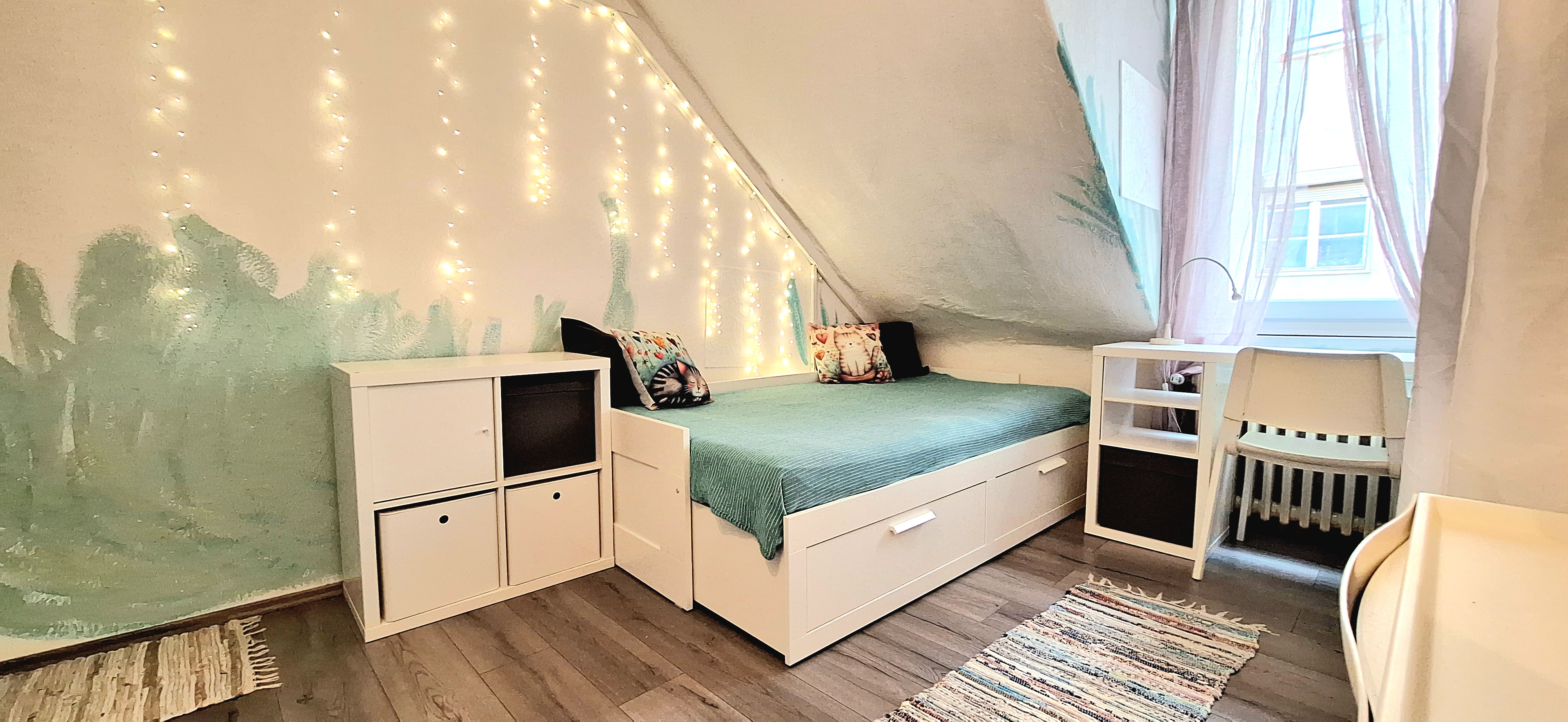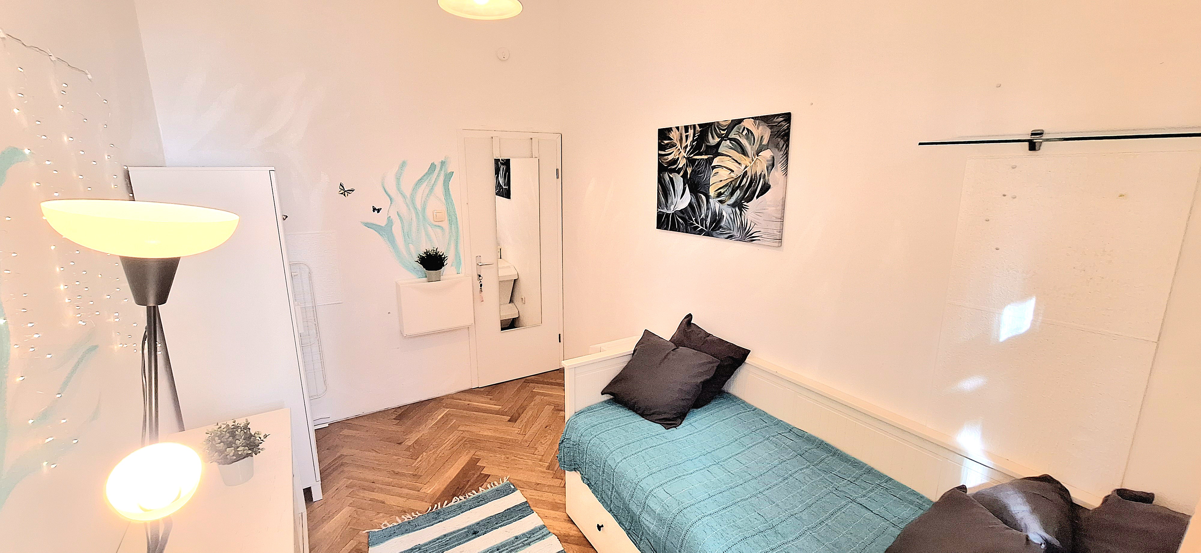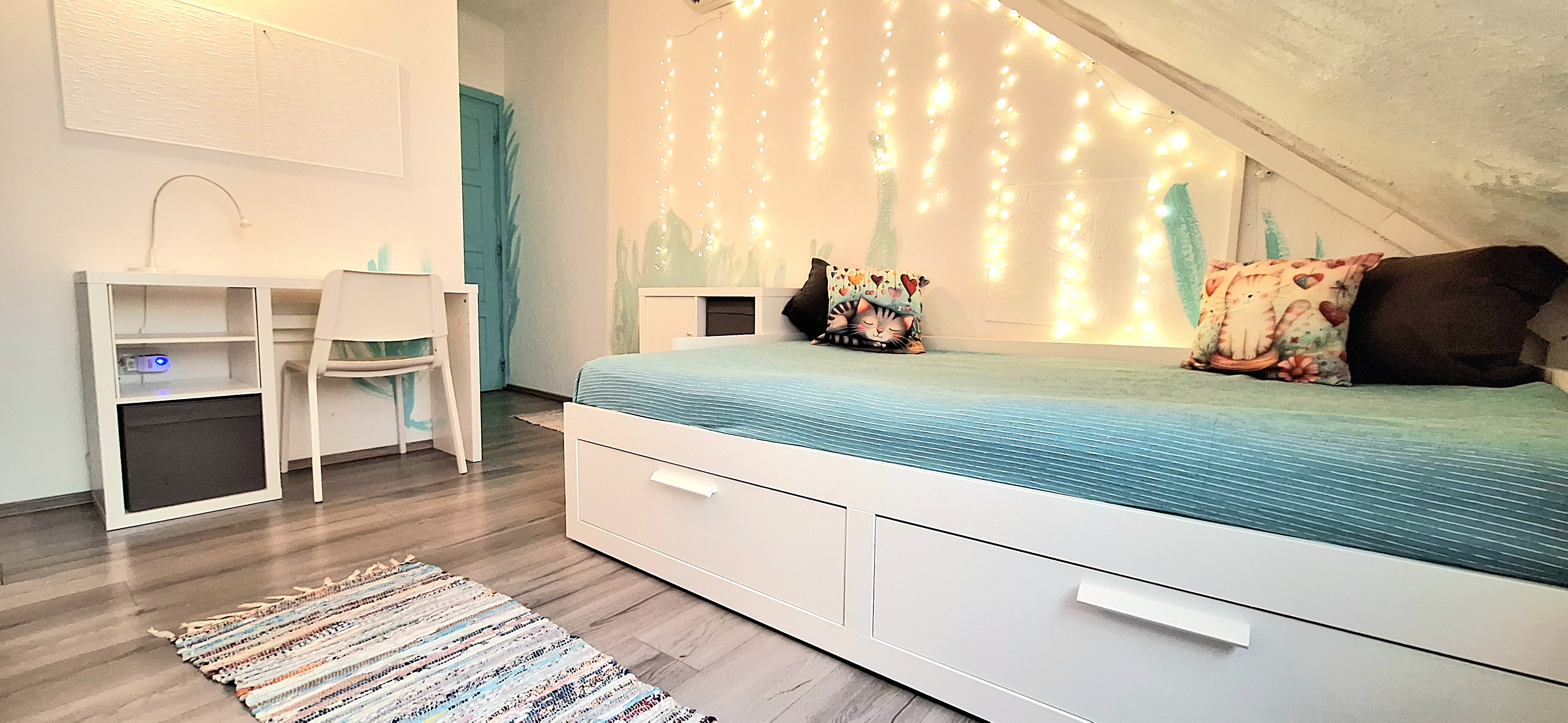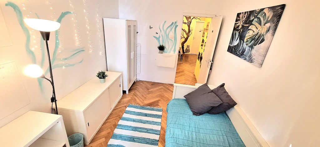 Blue room is fully furnished and comes with 1 cupboard, a table, chair 90x200cm bed, mirror, and a window that faces north with a view to the garden and has of course the signature Fairy lights for the warm and homey atmosphere. The tennant uses of following common spaces – bathroom (shower, washer, dryer, toilet and sink) fully equipped kitchen, lounge room and garden. Price 465 EUR + utilities.