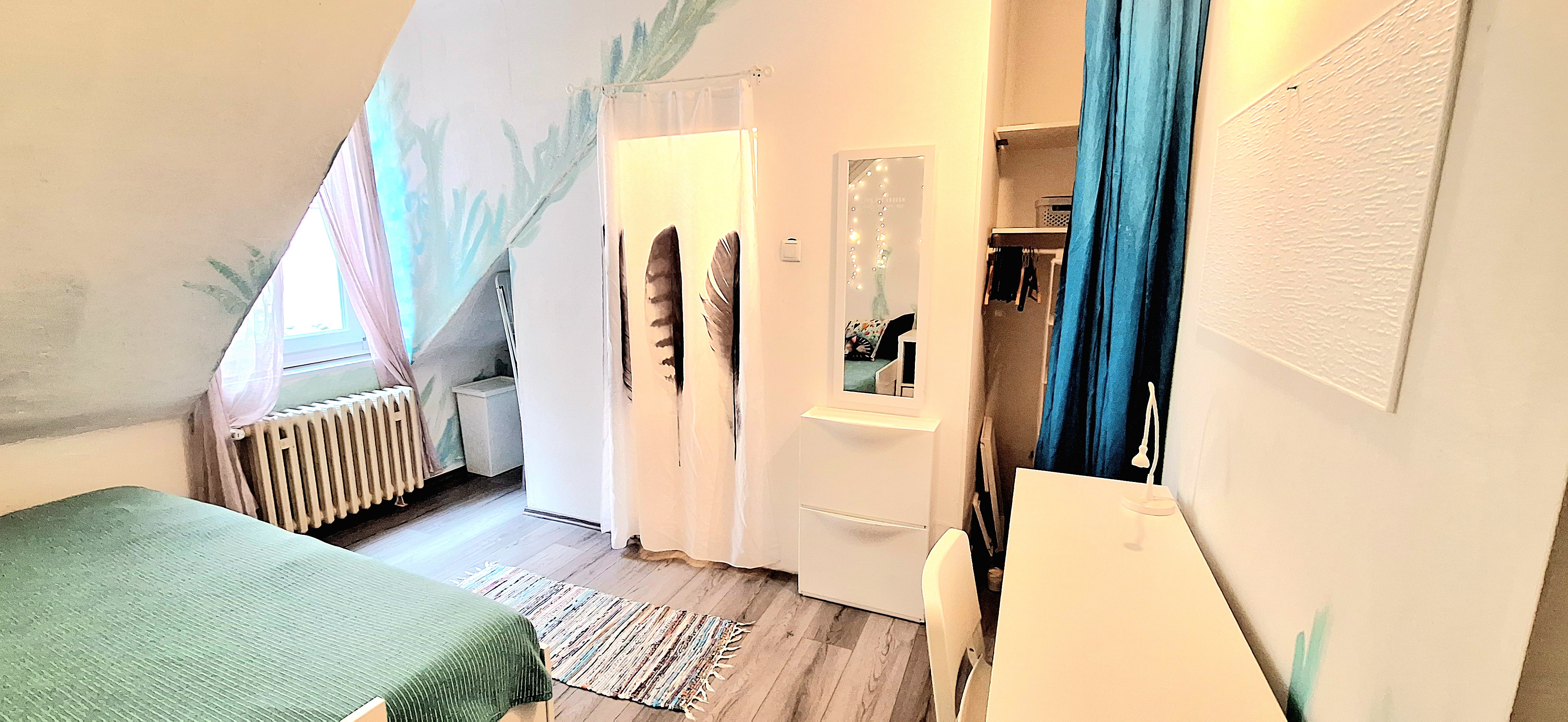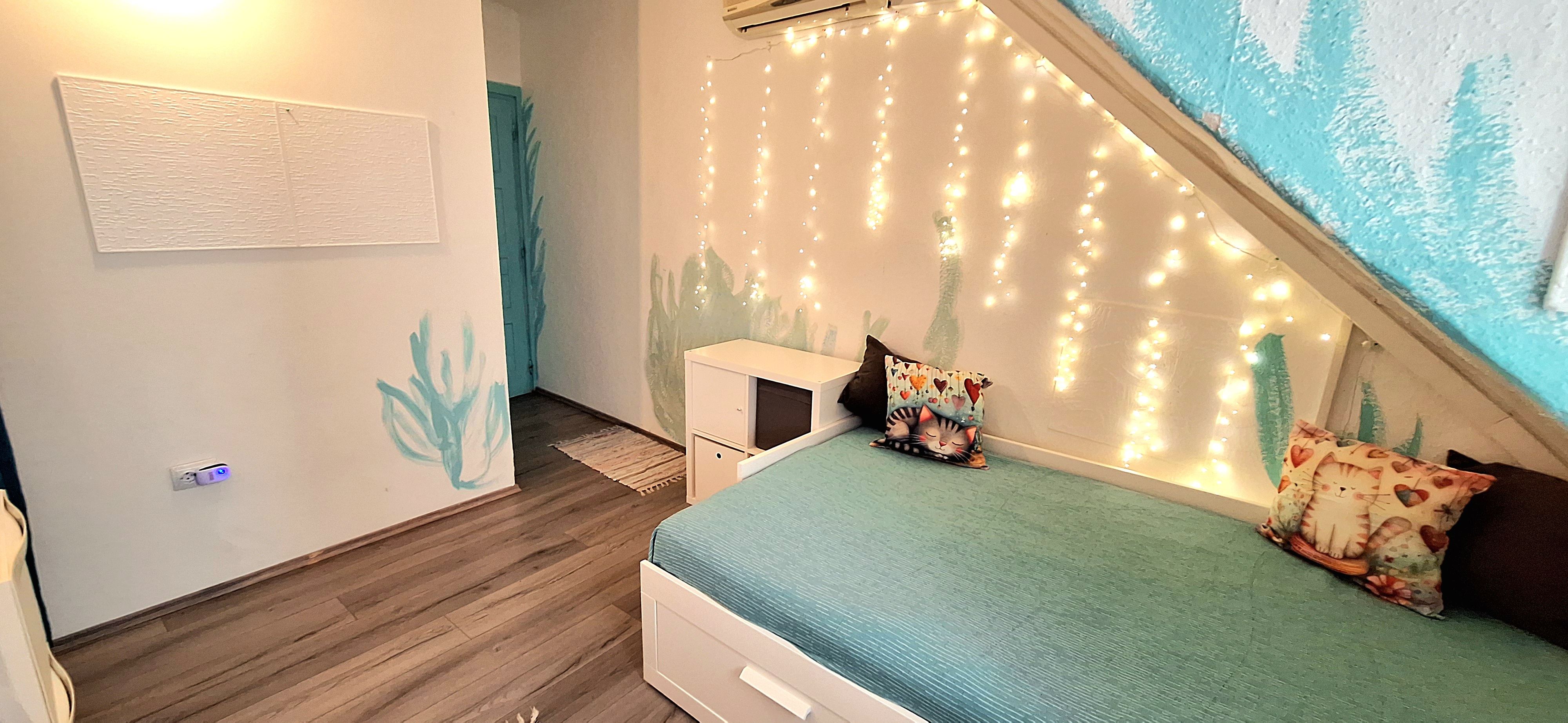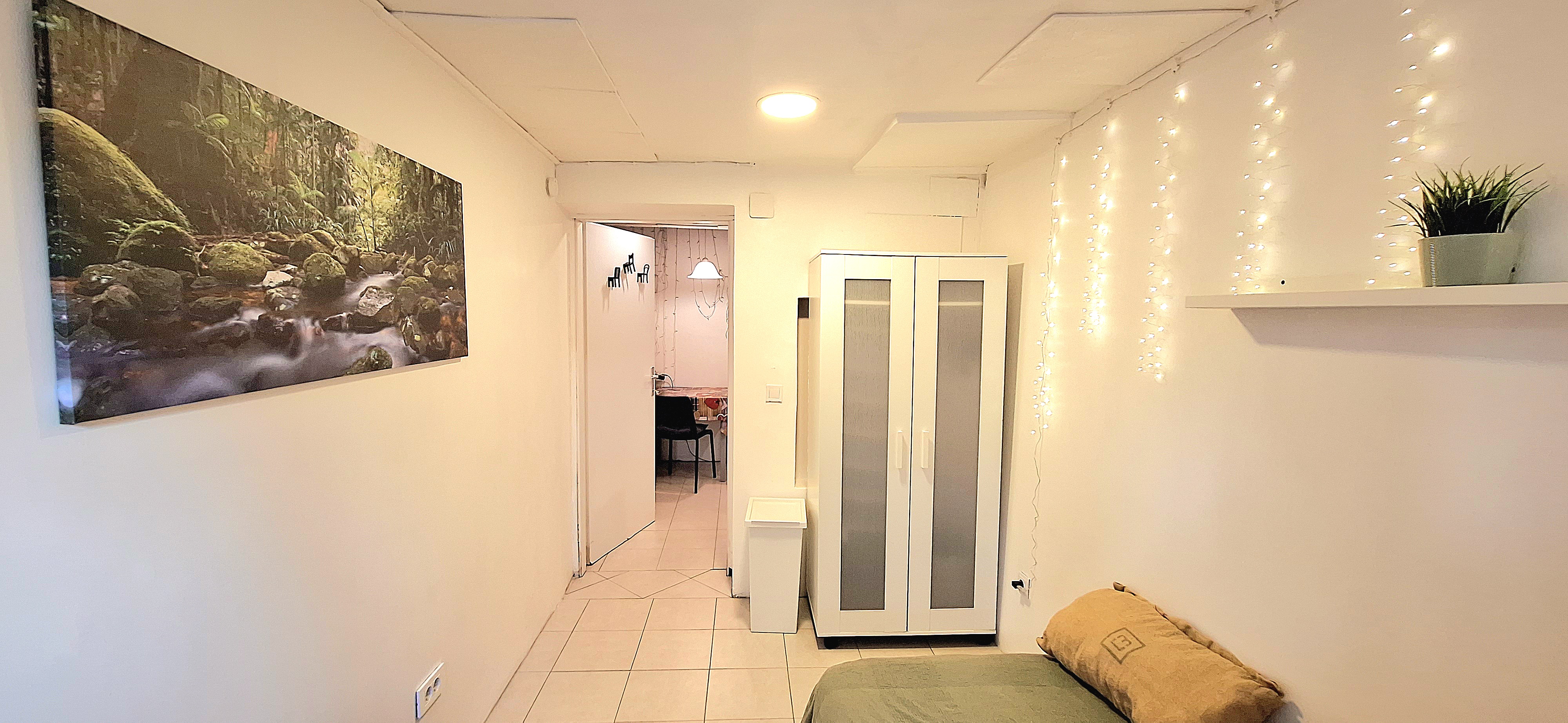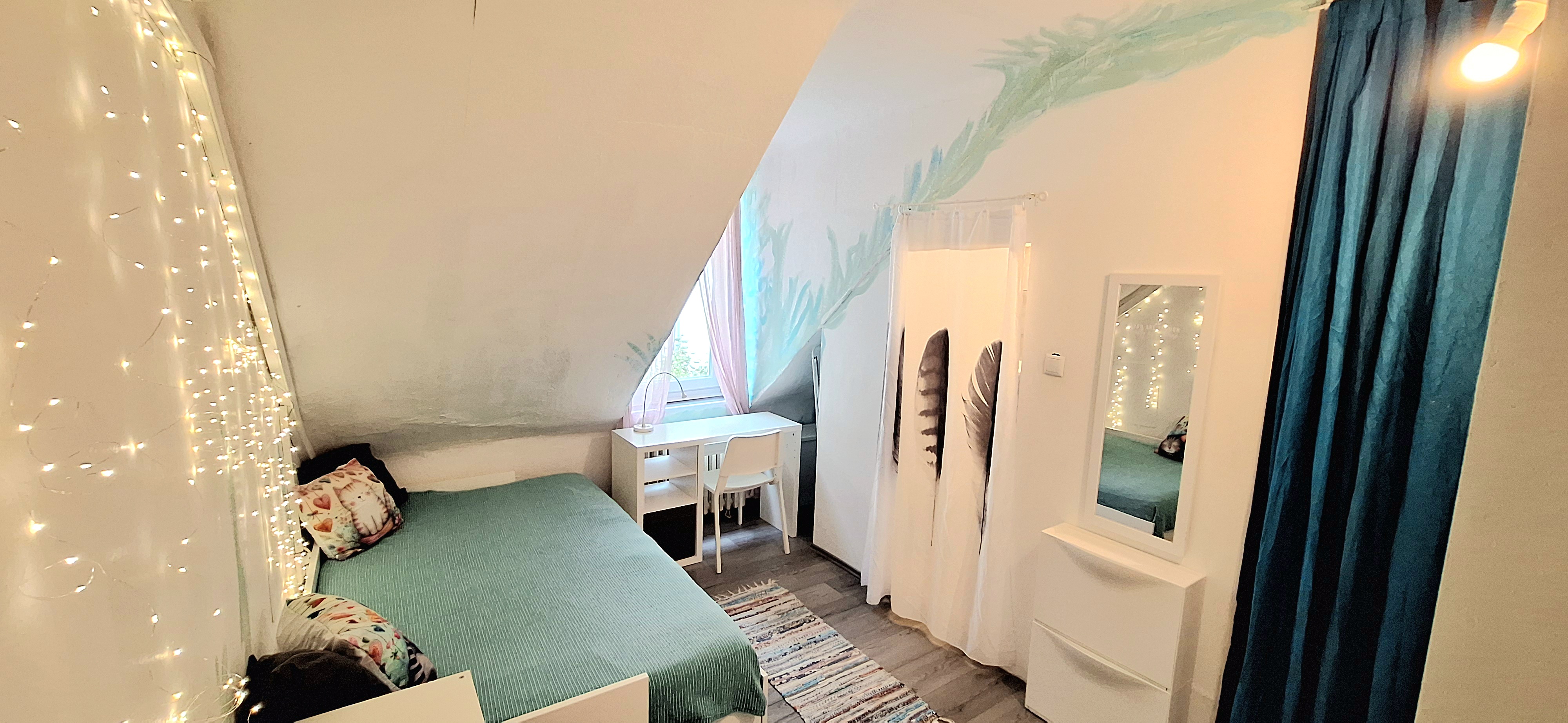 Blue room is fully furnished and comes with 1 cupboard, a table, chair 90x200cm bed, mirror, and a window that faces north with a view to the garden and has of course the signature Fairy lights for the warm and homey atmosphere. The tennant uses of following common spaces – bathroom (shower, washer, dryer, toilet and sink) fully equipped kitchen, lounge room and garden. Price 465 EUR + utilities.