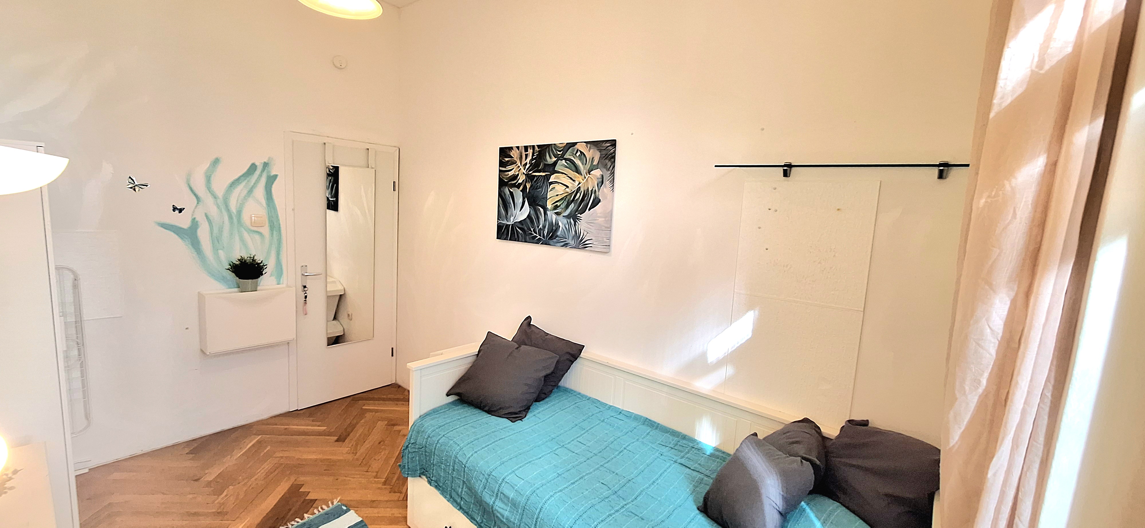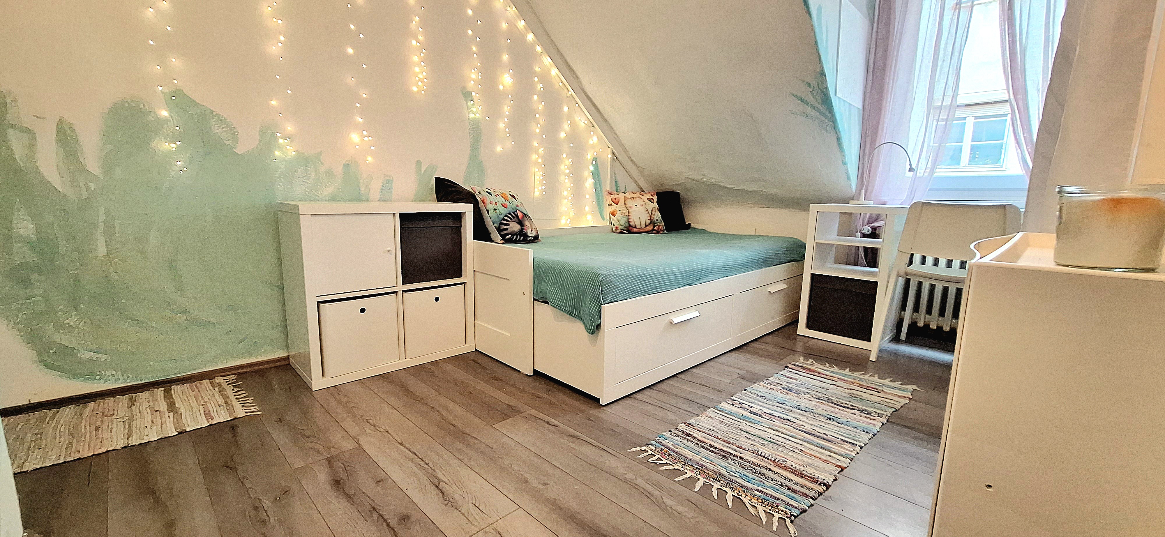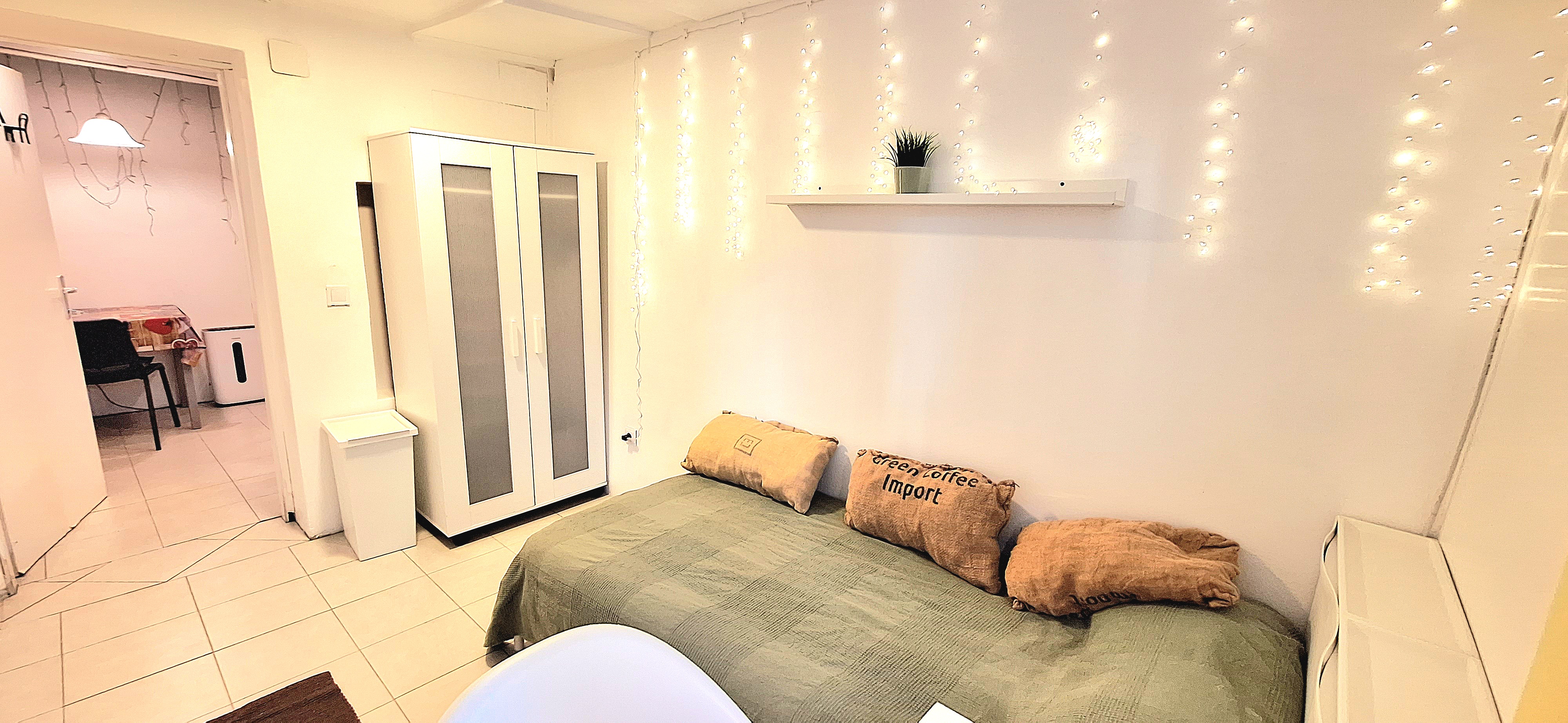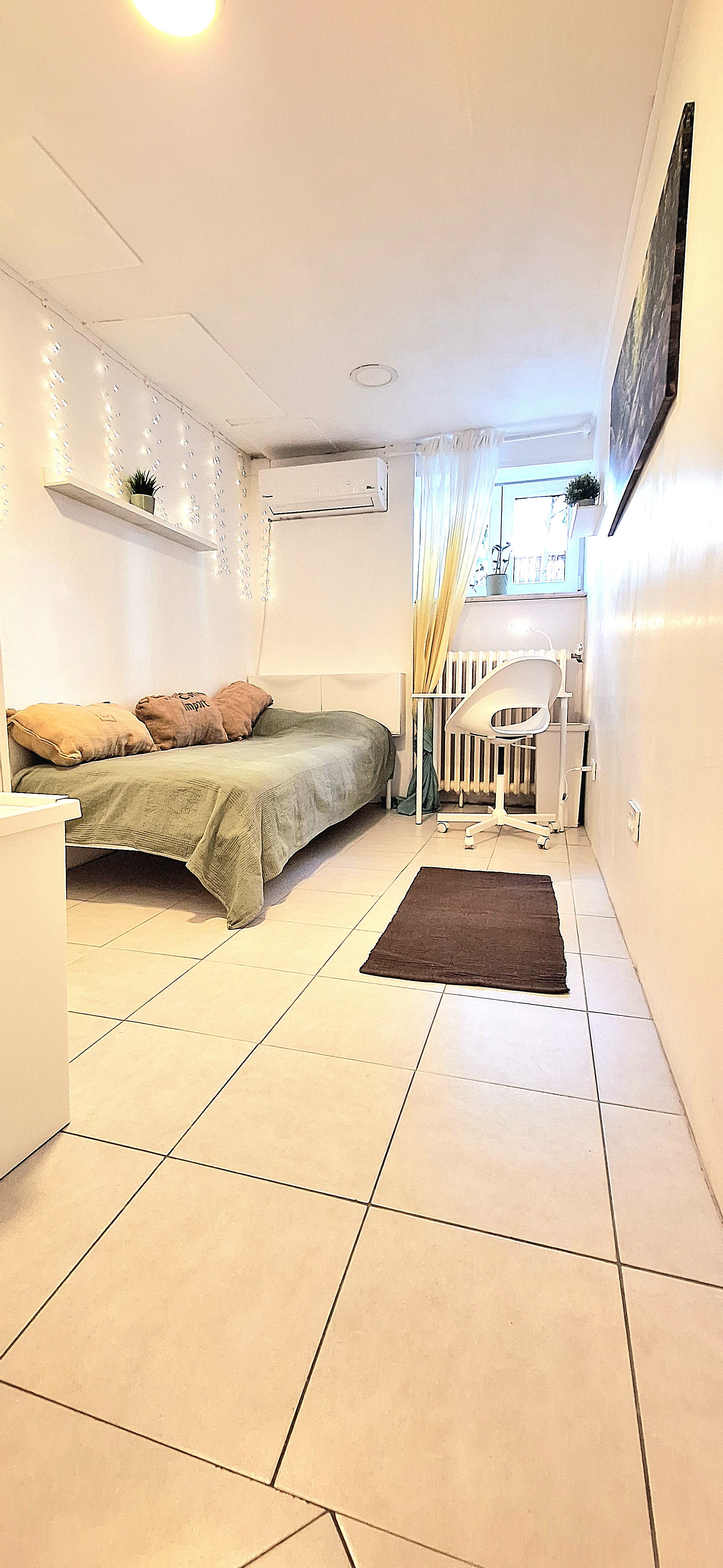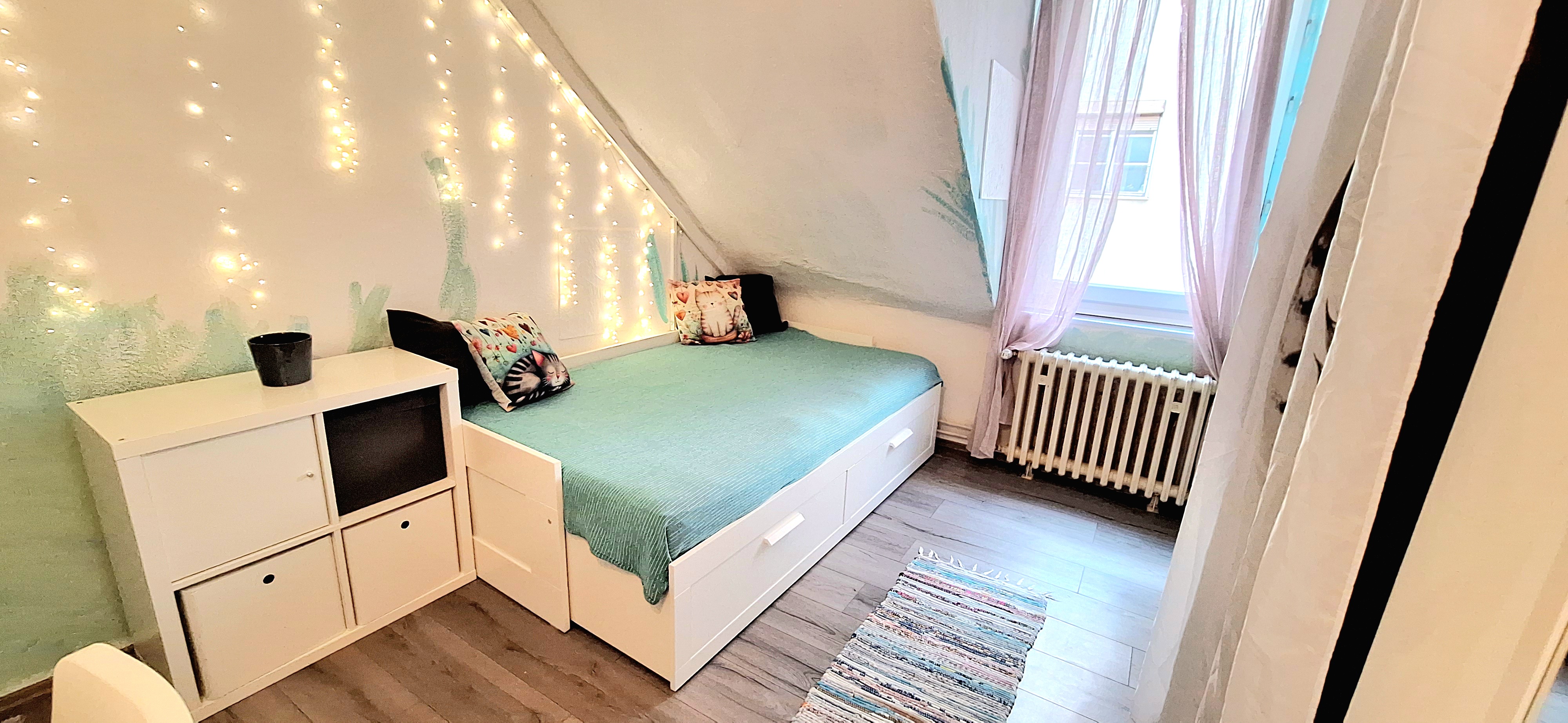 Blue room is fully furnished and comes with 1 cupboard, a table, chair 90x200cm bed, mirror, and a window that faces north with a view to the garden and has of course the signature Fairy lights for the warm and homey atmosphere. The tennant uses of following common spaces – bathroom (shower, washer, dryer, toilet and sink) fully equipped kitchen, lounge room and garden. Price 465 EUR + utilities.