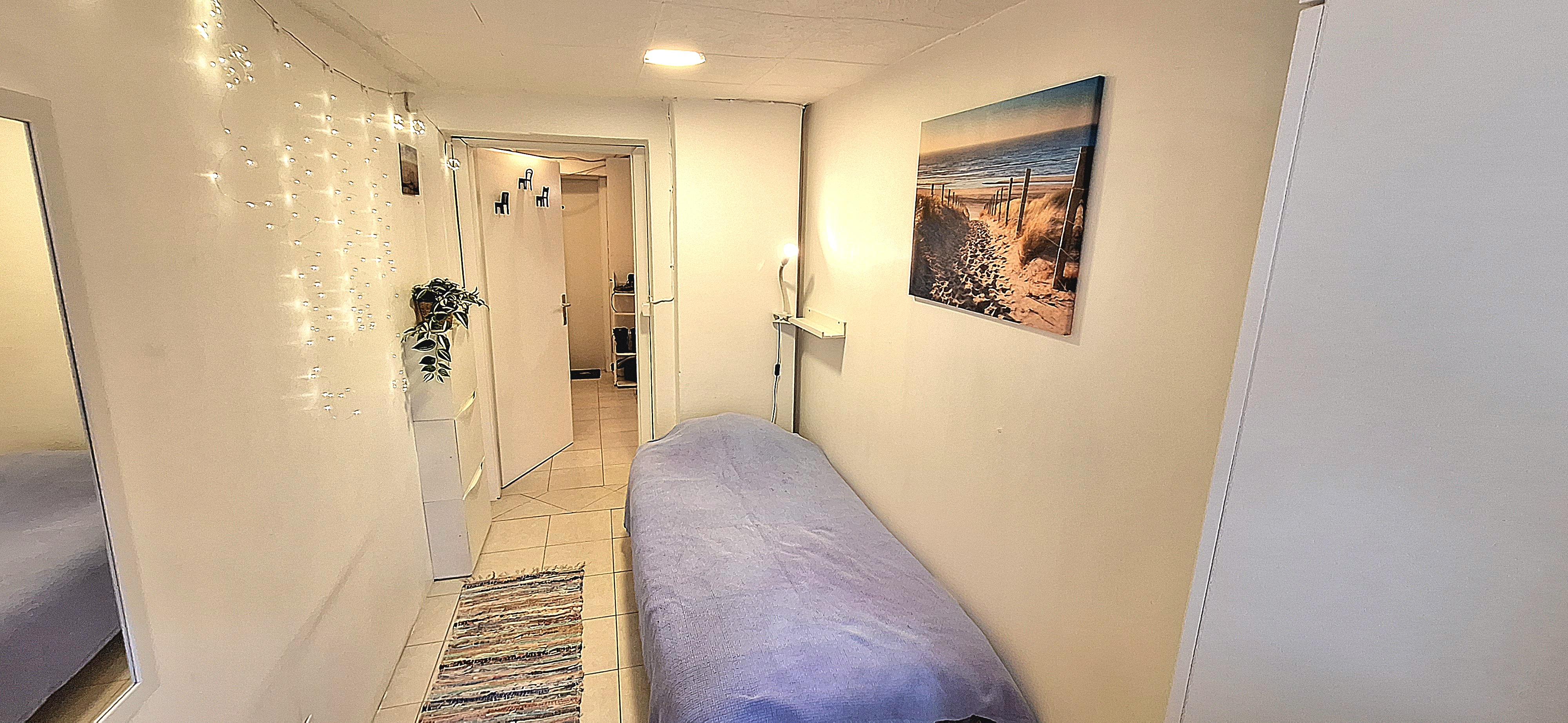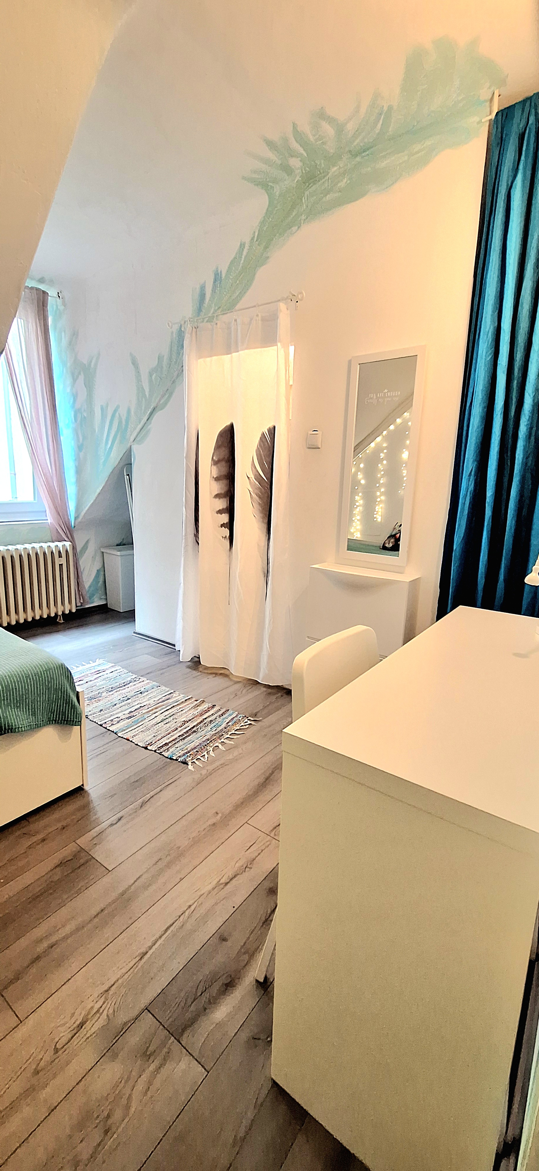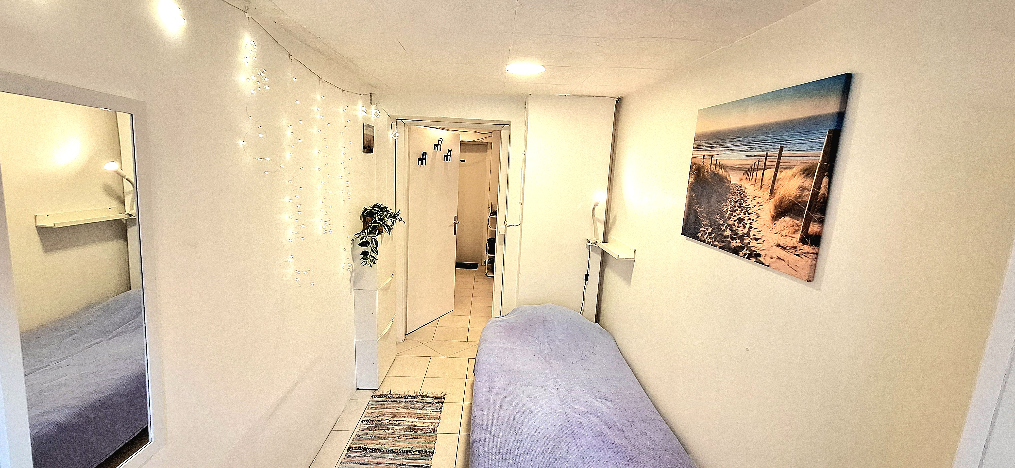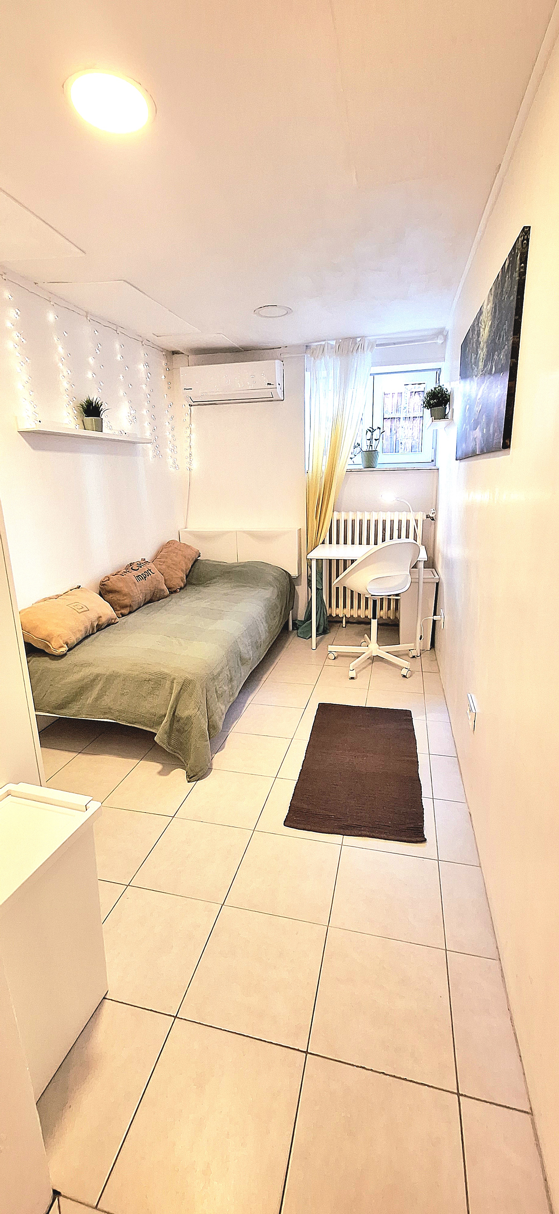 Blue room is fully furnished and comes with 1 cupboard, a table, chair 90x200cm bed, mirror, and a window that faces north with a view to the garden and has of course the signature Fairy lights for the warm and homey atmosphere. The tennant uses of following common spaces – bathroom (shower, washer, dryer, toilet and sink) fully equipped kitchen, lounge room and garden. Price 465 EUR + utilities.