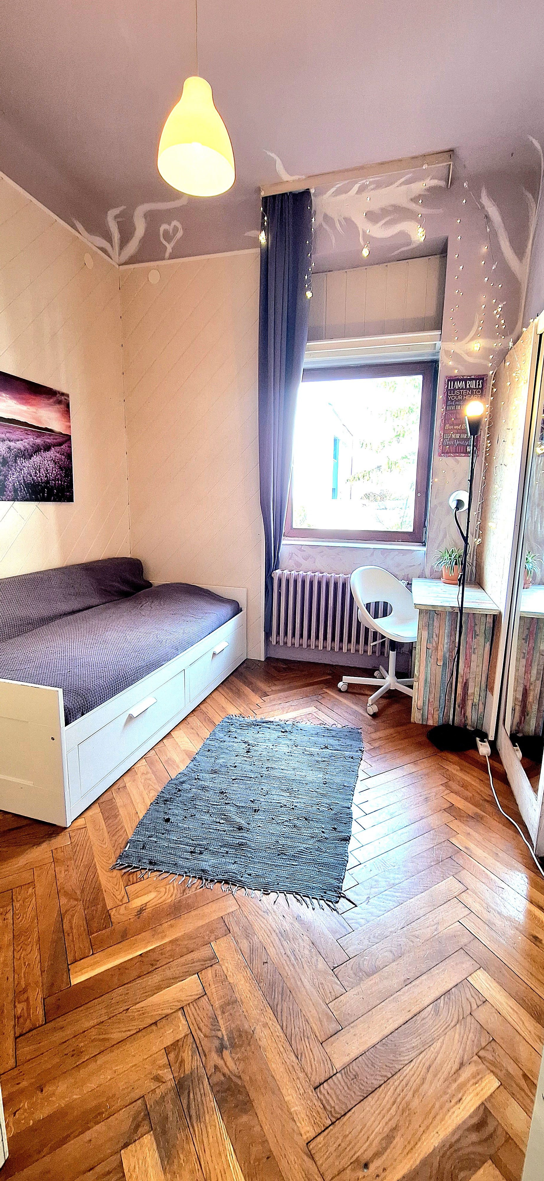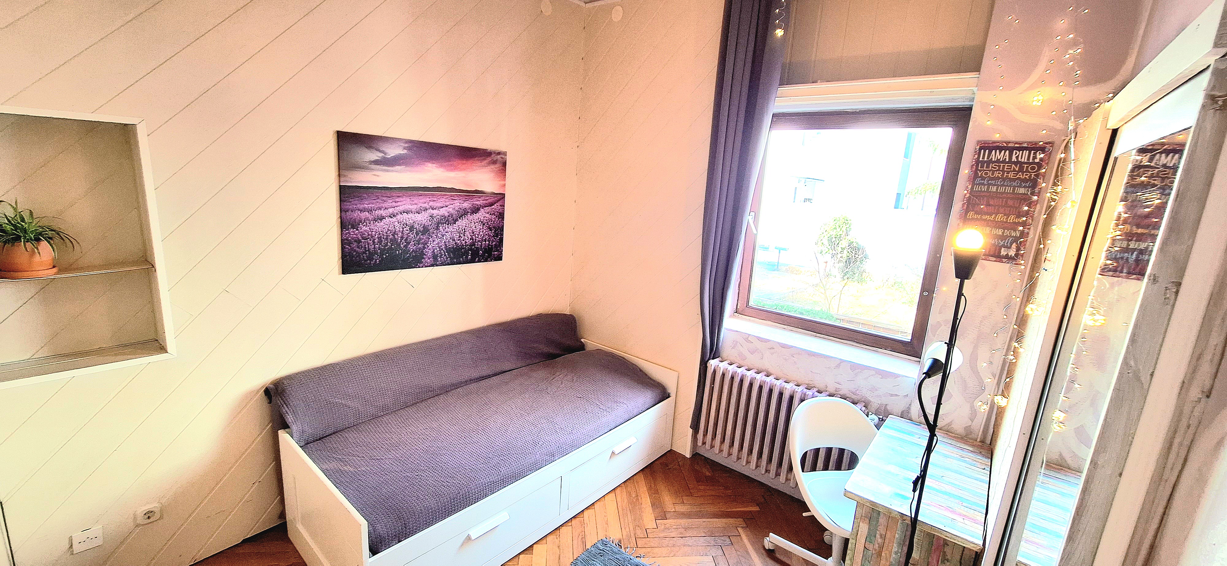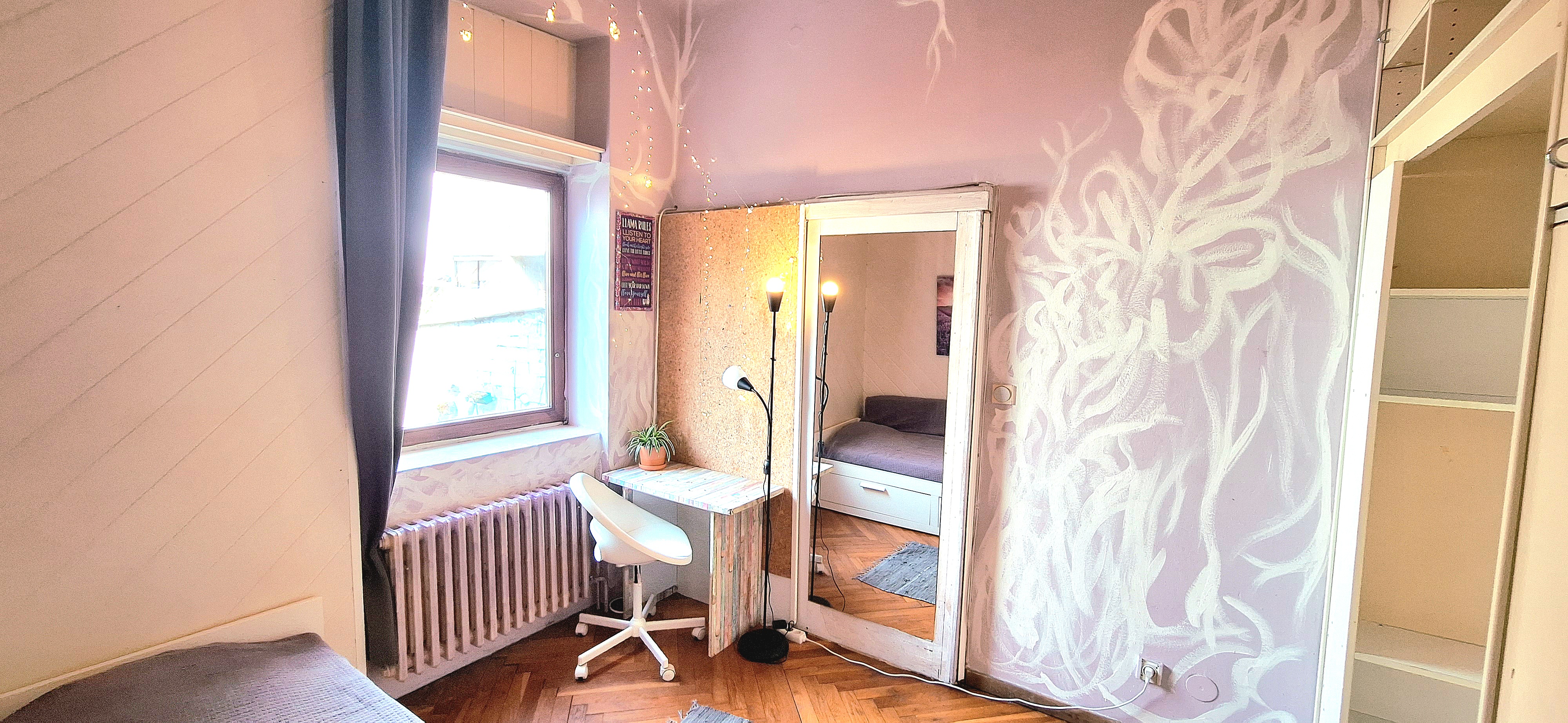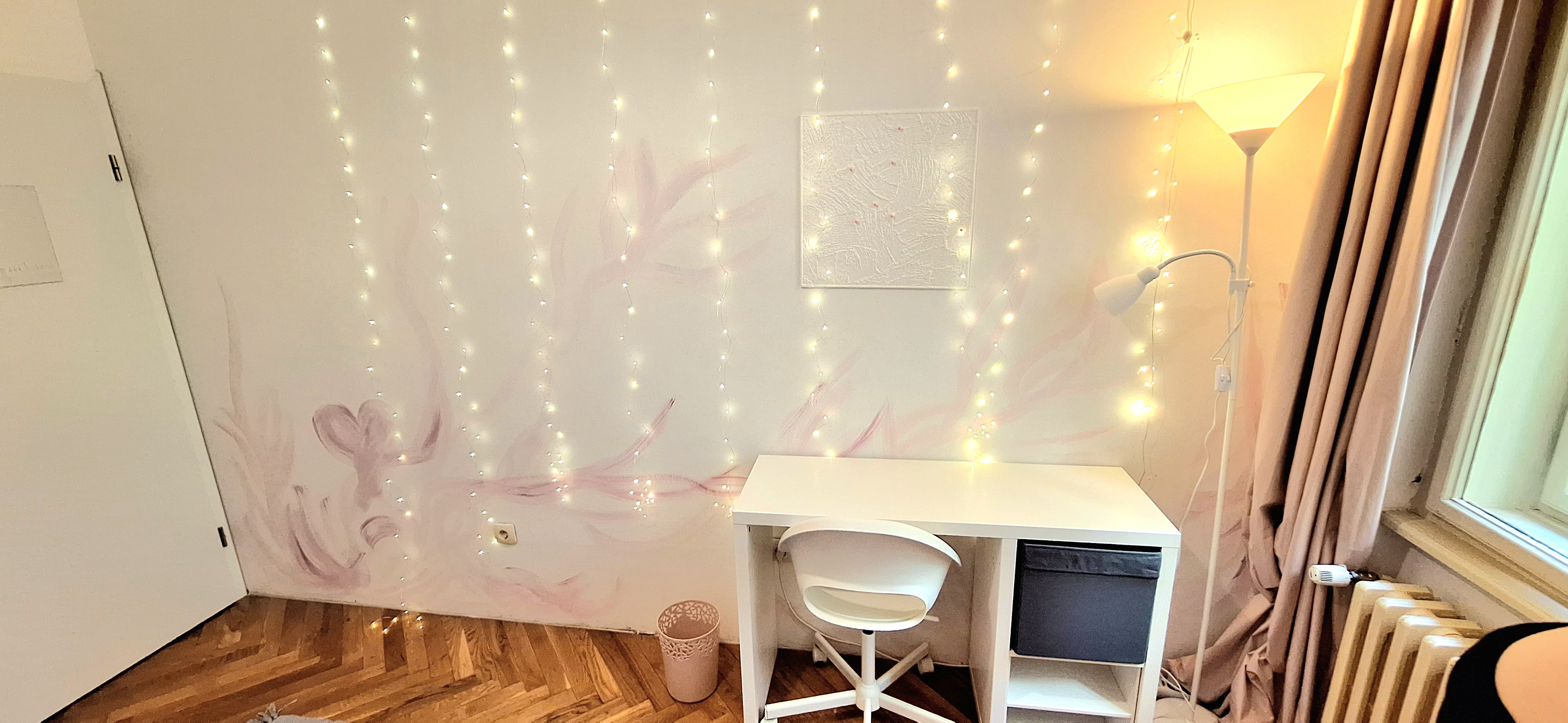 Lavender room is facing North and its next to the main bathroom. Its great for one person that needs a lot of storage space as it has a huge cabinet. The room is fully furnished with a Brimnes IKEA bed that can be either a 90×200 or 160x200cm for guests or comfort, table, chair, lamp, bookshelves and the huge cabinet, black out curtain and of course Fairy lights. Use of following common spaces – bathroom (bathtub, washer, dryer, toilet and sink) fully equipped kitchen, Lounge room , terrace and garden. Price 480 EUR + utilities.