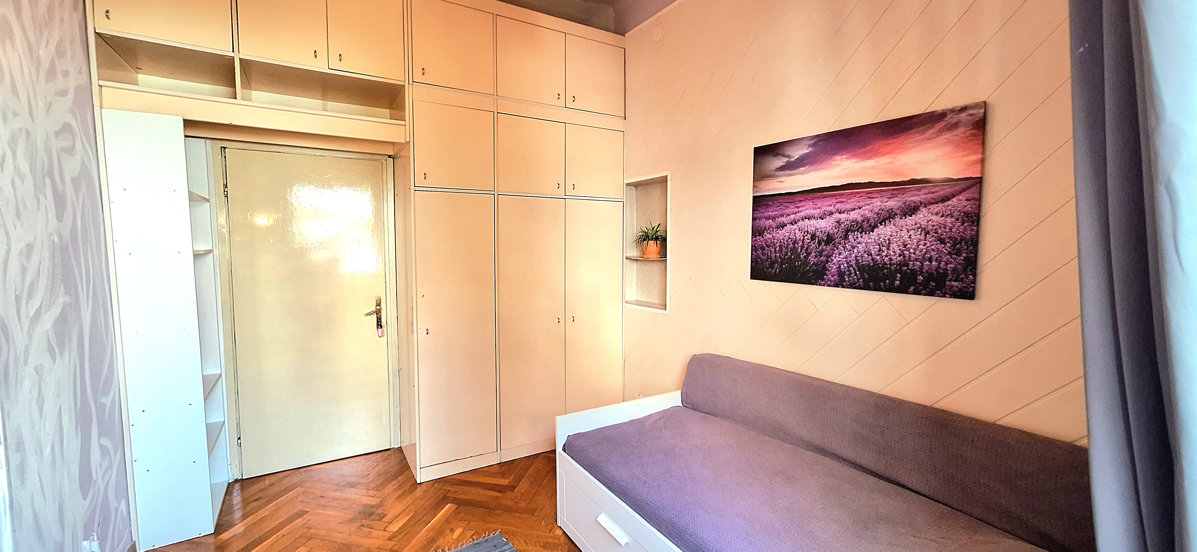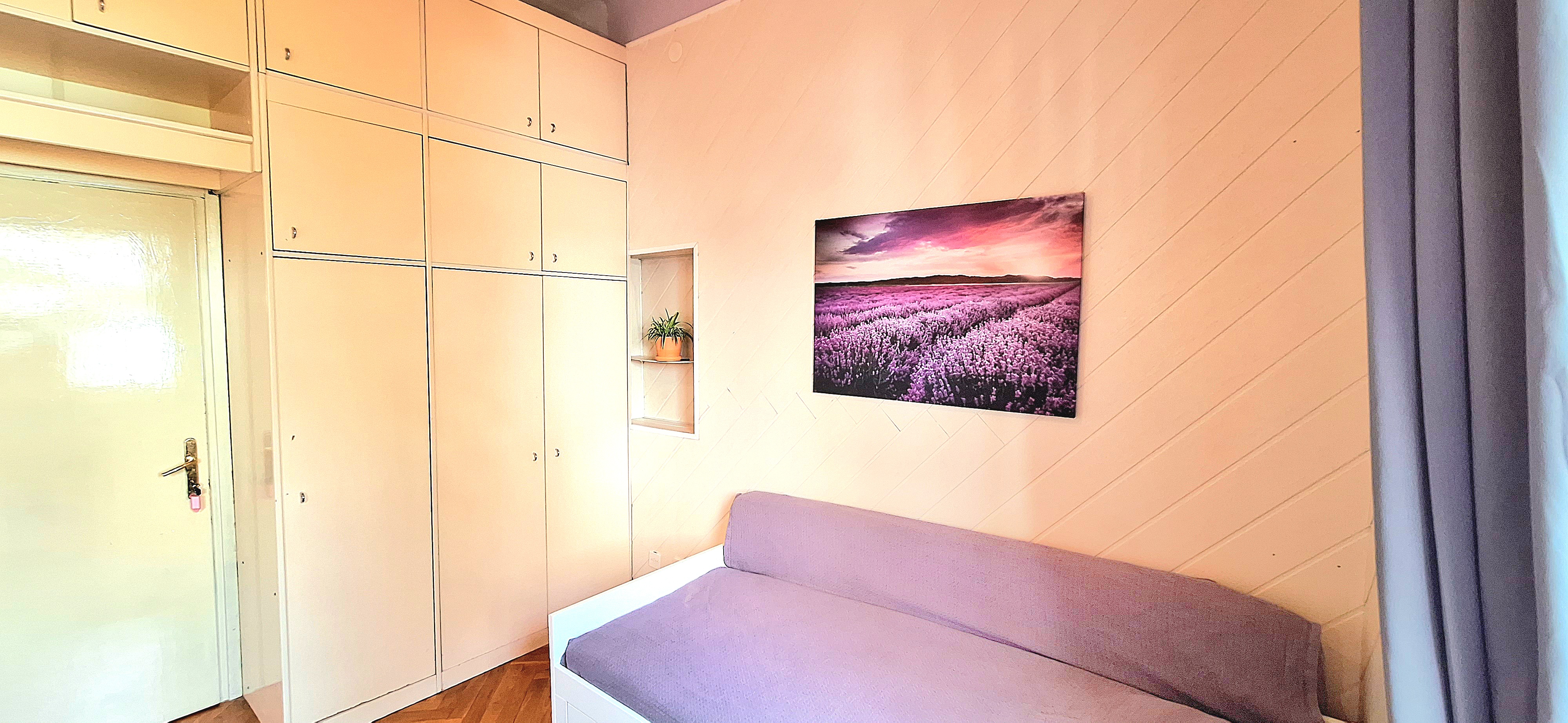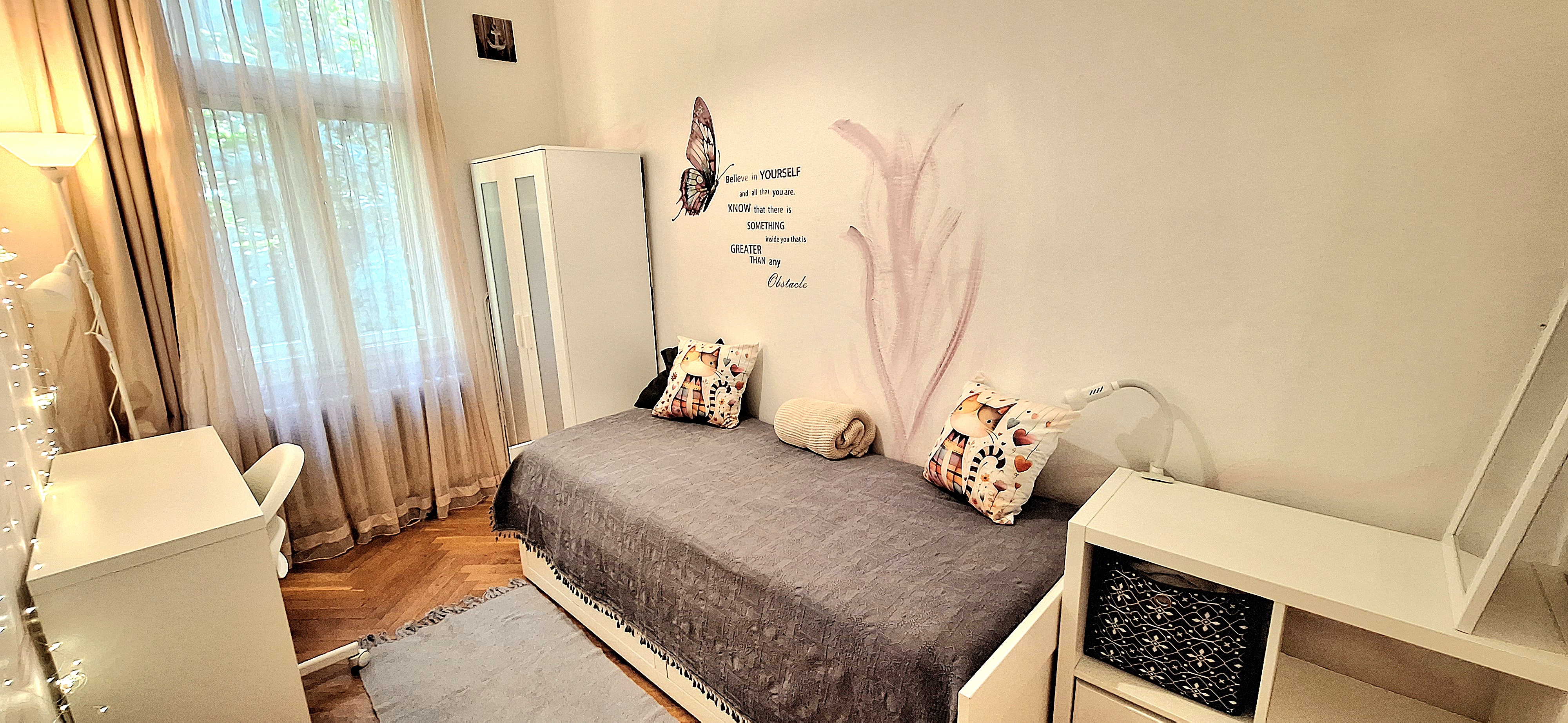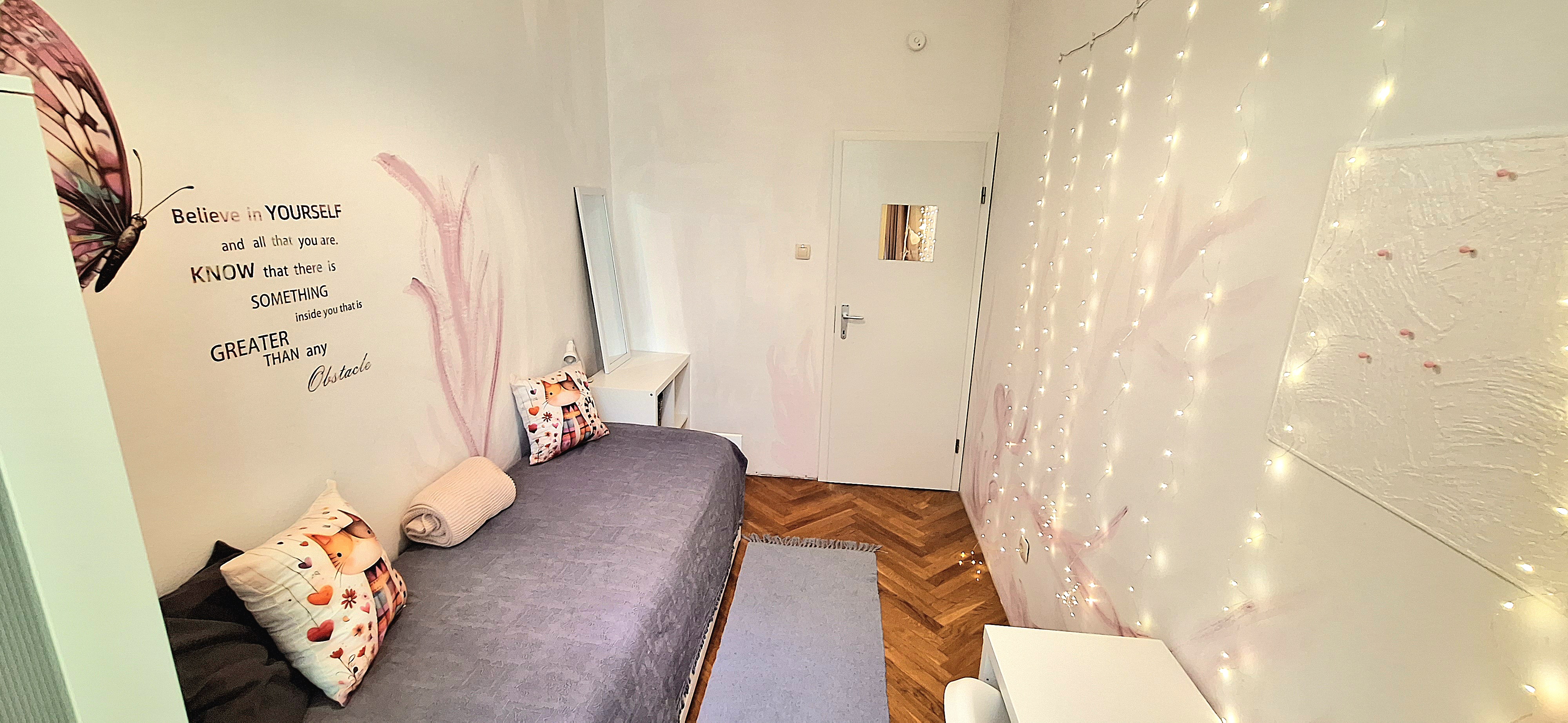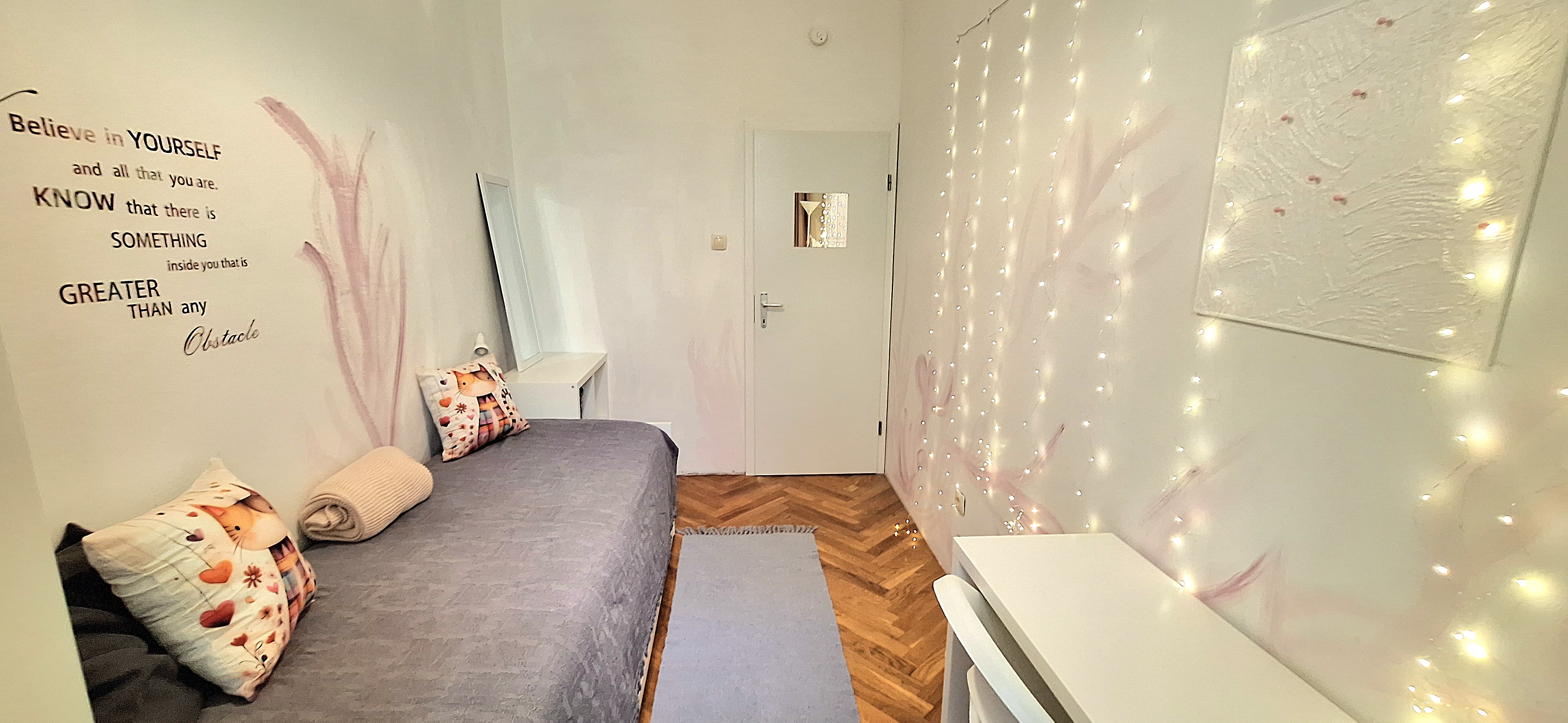 Lavender room is facing North and its next to the main bathroom. Its great for one person that needs a lot of storage space as it has a huge cabinet. The room is fully furnished with a Brimnes IKEA bed that can be either a 90×200 or 160x200cm for guests or comfort, table, chair, lamp, bookshelves and the huge cabinet, black out curtain and of course Fairy lights. Use of following common spaces – bathroom (bathtub, washer, dryer, toilet and sink) fully equipped kitchen, Lounge room , terrace and garden. Price 480 EUR + utilities.