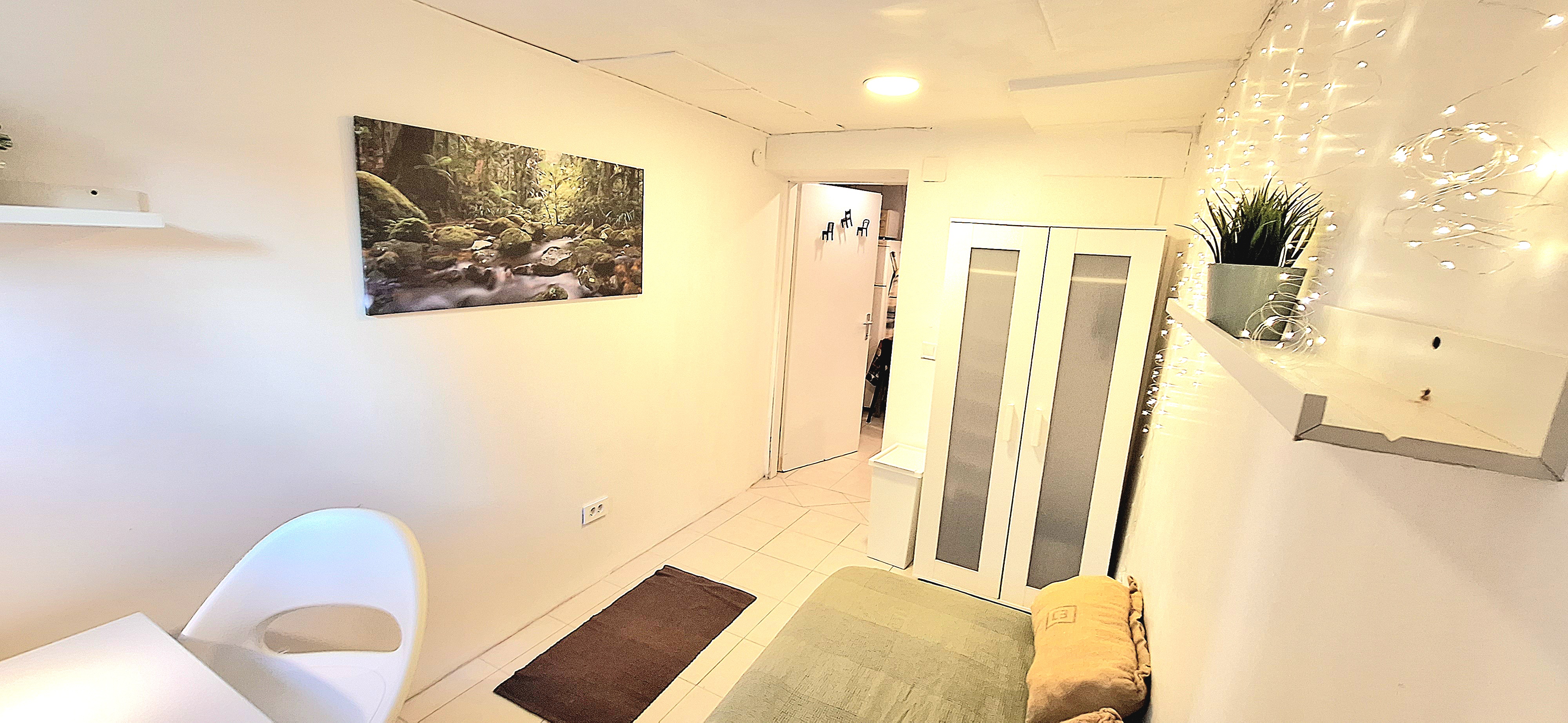 Nature Spa Room is the only room in the house with a private bathroom with a toilet, sink and a shower. The room is quiet, bright and airy. The bed is 140x 200, has an open closet, chair, table, 2 cupboards and an air-conditioning unit. Its a room that is on the top floor facing east of the House. Tenant uses the main kitchen for cooking. Price: 530 EUR + utilities.